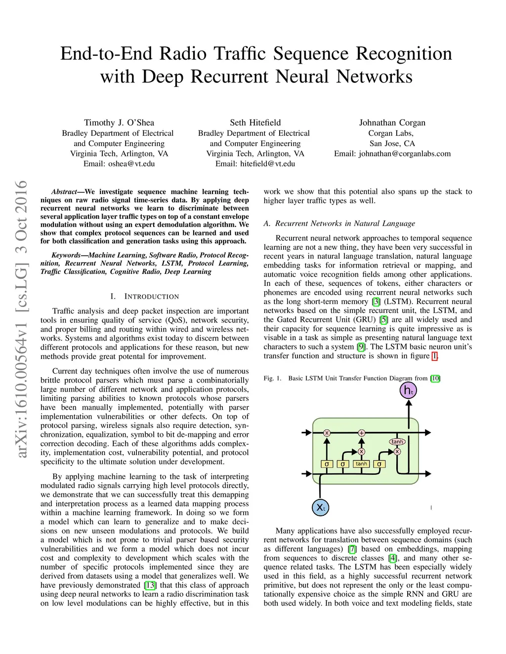 We investigate sequence machine learning techniques on raw radio signal time-series data. By applying deep recurrent neural networks we learn to discriminate between several application layer traffic types on top of a constant envelope modulation without using an expert demodulation algorithm. We show that complex protocol sequences can be learned and used for both classification and generation tasks using this approach.