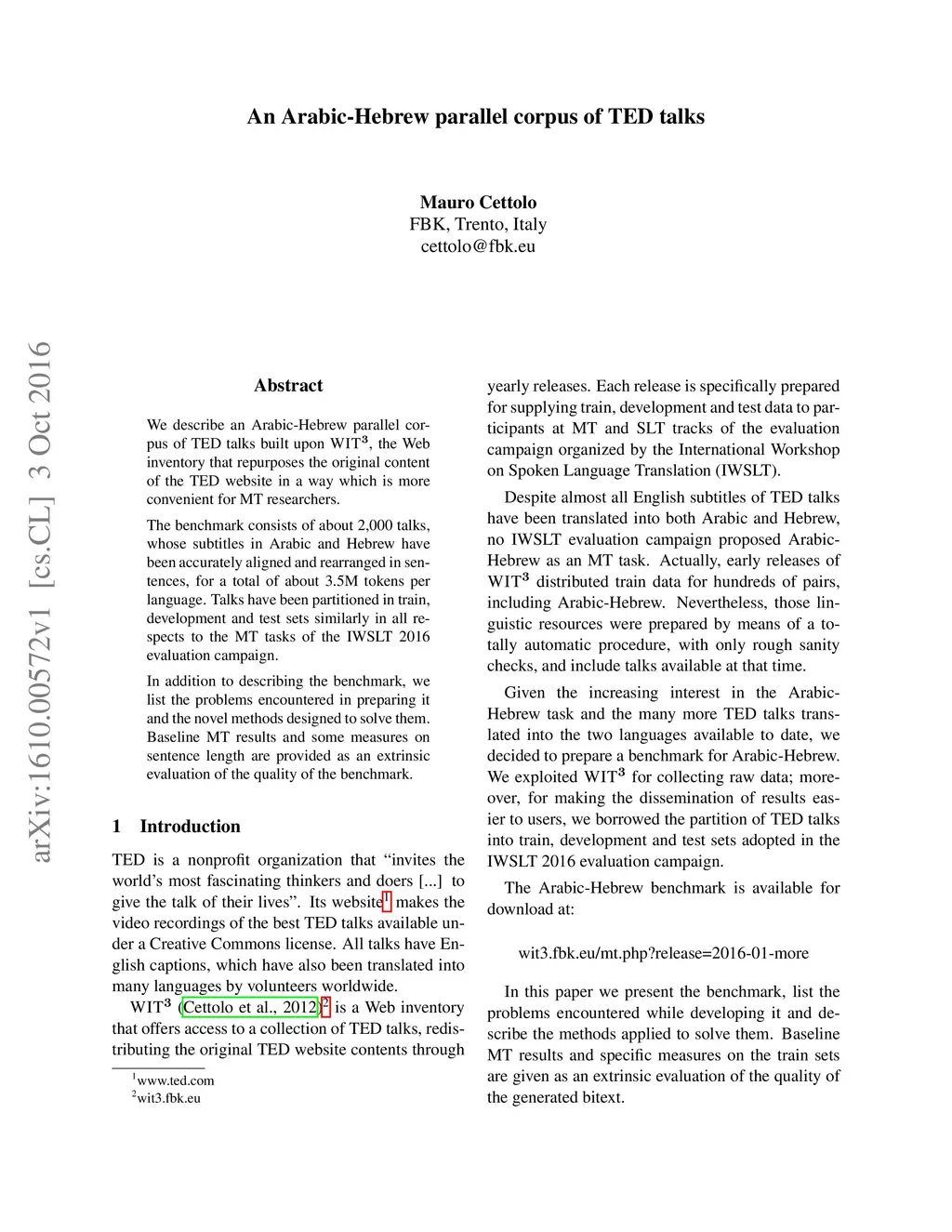 We describe an Arabic-Hebrew parallel corpus of TED talks built upon WIT3, the Web inventory that repurposes the original content of the TED website in a way which is more convenient for MT researchers. The benchmark consists of about 2,000 talks, whose subtitles in Arabic and Hebrew have been accurately aligned and rearranged in sentences, for a total of about 3.5M tokens per language. Talks have been partitioned in train, development and test sets similarly in all respects to the MT tasks of the IWSLT 2016 evaluation campaign. In addition to describing the benchmark, we list the problems encountered in preparing it and the novel methods designed to solve them. Baseline MT results and some measures on sentence length are provided as an extrinsic evaluation of the quality of the benchmark.