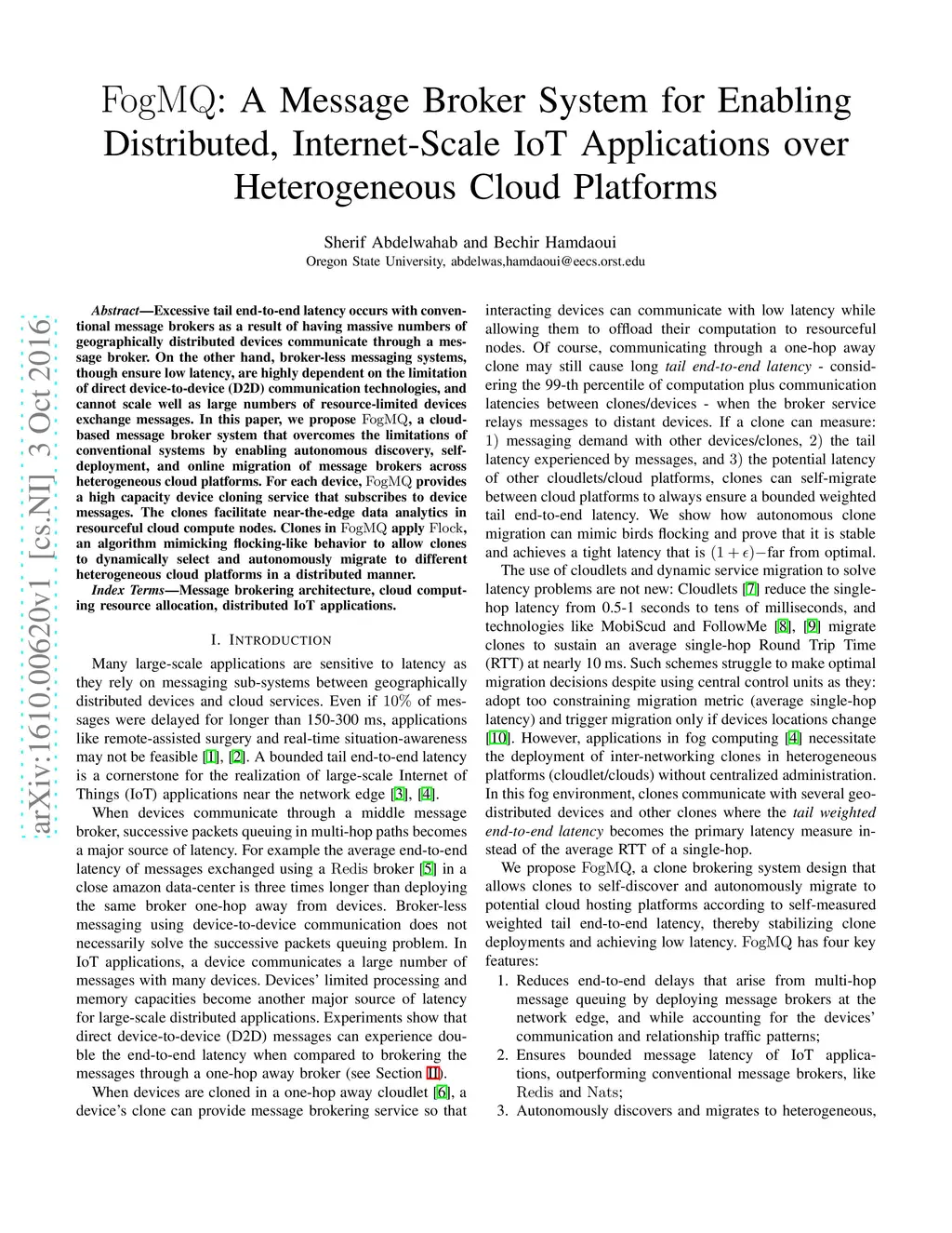 Excessive tail end-to-end latency occurs with conventional message brokers as a result of having massive numbers of geographically distributed devices communicate through a message broker. On the other hand, broker-less messaging systems, though ensure low latency, are highly dependent on the limitation of direct device-to-device (D2D) communication technologies, and cannot scale well as large numbers of resource-limited devices exchange messages. In this paper, we propose FogMQ, a cloud-based message broker system that overcomes the limitations of conventional systems by enabling autonomous discovery, self-deployment, and online migration of message brokers across heterogeneous cloud platforms. For each device, FogMQ provides a high capacity device cloning service that subscribes to device messages. The clones facilitate near-the-edge data analytics in resourceful cloud compute nodes. Clones in FogMQ apply Flock, an algorithm mimicking flocking-like behavior to allow clones to dynamically select and autonomously migrate to different heterogeneous cloud platforms in a distributed manner.