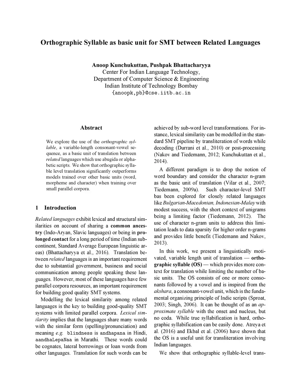 Orthographic Syllable as basic unit for SMT between Related Languages