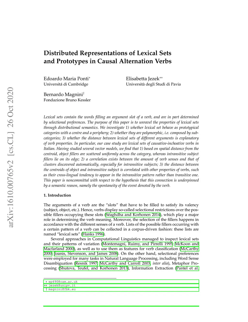 Lexical sets contain the words filling an argument slot of a verb, and are in part determined by selectional preferences. The purpose of this paper is to unravel the properties of lexical sets through distributional semantics. We investigate 1) whether lexical set behave as prototypical categories with a centre and a periphery; 2) whether they are polymorphic, i.e. composed by subcategories; 3) whether the distance between lexical sets of different arguments is explanatory of verb properties. In particular, our case study are lexical sets of causative-inchoative verbs in Italian. Having studied several vector models, we find that 1) based on spatial distance from the centroid, object fillers are scattered uniformly across the category, whereas intransitive subject fillers lie on its edge; 2) a correlation exists between the amount of verb senses and that of clusters discovered automatically, especially for intransitive subjects; 3) the distance between the centroids of object and intransitive subject is correlated with other properties of verbs, such as their cross-lingual tendency to appear in the intransitive pattern rather than transitive one. This paper is noncommittal with respect to the hypothesis that this connection is underpinned by a semantic reason, namely the spontaneity of the event denoted by the verb.
