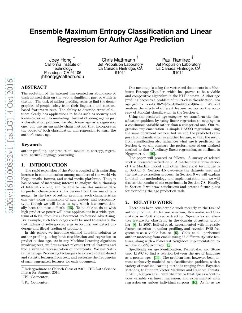 Ensemble Maximum Entropy Classification and Linear Regression for Author