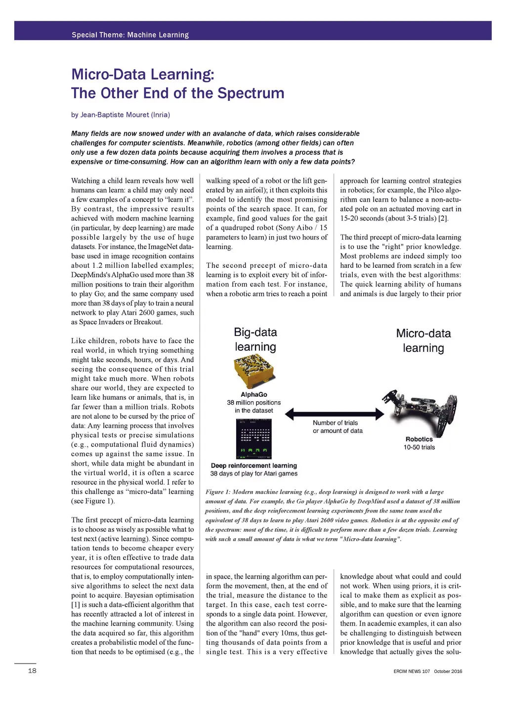 Many fields are now snowed under with an avalanche of data, which raises considerable challenges for computer scientists. Meanwhile, robotics (among other fields) can often only use a few dozen data points because acquiring them involves a process that is expensive or time-consuming. How can an algorithm learn with only a few data points?
