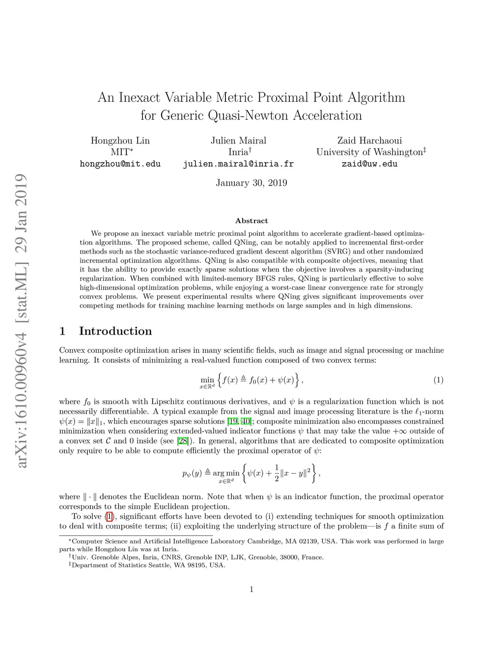 We propose an inexact variable-metric proximal point algorithm to accelerate gradient-based optimization algorithms. The proposed scheme, called QNing can be notably applied to incremental first-order methods such as the stochastic variance-reduced gradient descent algorithm (SVRG) and other randomized incremental optimization algorithms. QNing is also compatible with composite objectives, meaning that it has the ability to provide exactly sparse solutions when the objective involves a sparsity-inducing regularization. When combined with limited-memory BFGS rules, QNing is particularly effective to solve high-dimensional optimization problems, while enjoying a worst-case linear convergence rate for strongly convex problems. We present experimental results where QNing gives significant improvements over competing methods for training machine learning methods on large samples and in high dimensions.