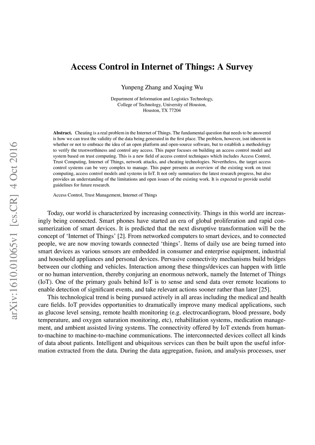 Cheating is a real problem in the Internet of Things. The fundamental question that needs to be answered is how we can trust the validity of the data being generated in the first place. The problem, however, isn't inherent in whether or not to embrace the idea of an open platform and open-source software, but to establish a methodology to verify the trustworthiness and control any access. This paper focuses on building an access control model and system based on trust computing. This is a new field of access control techniques which includes Access Control, Trust Computing, Internet of Things, network attacks, and cheating technologies. Nevertheless, the target access control systems can be very complex to manage. This paper presents an overview of the existing work on trust computing, access control models and systems in IoT. It not only summarizes the latest research progress, but also provides an understanding of the limitations and open issues of the existing work. It is expected to provide useful guidelines for future research.