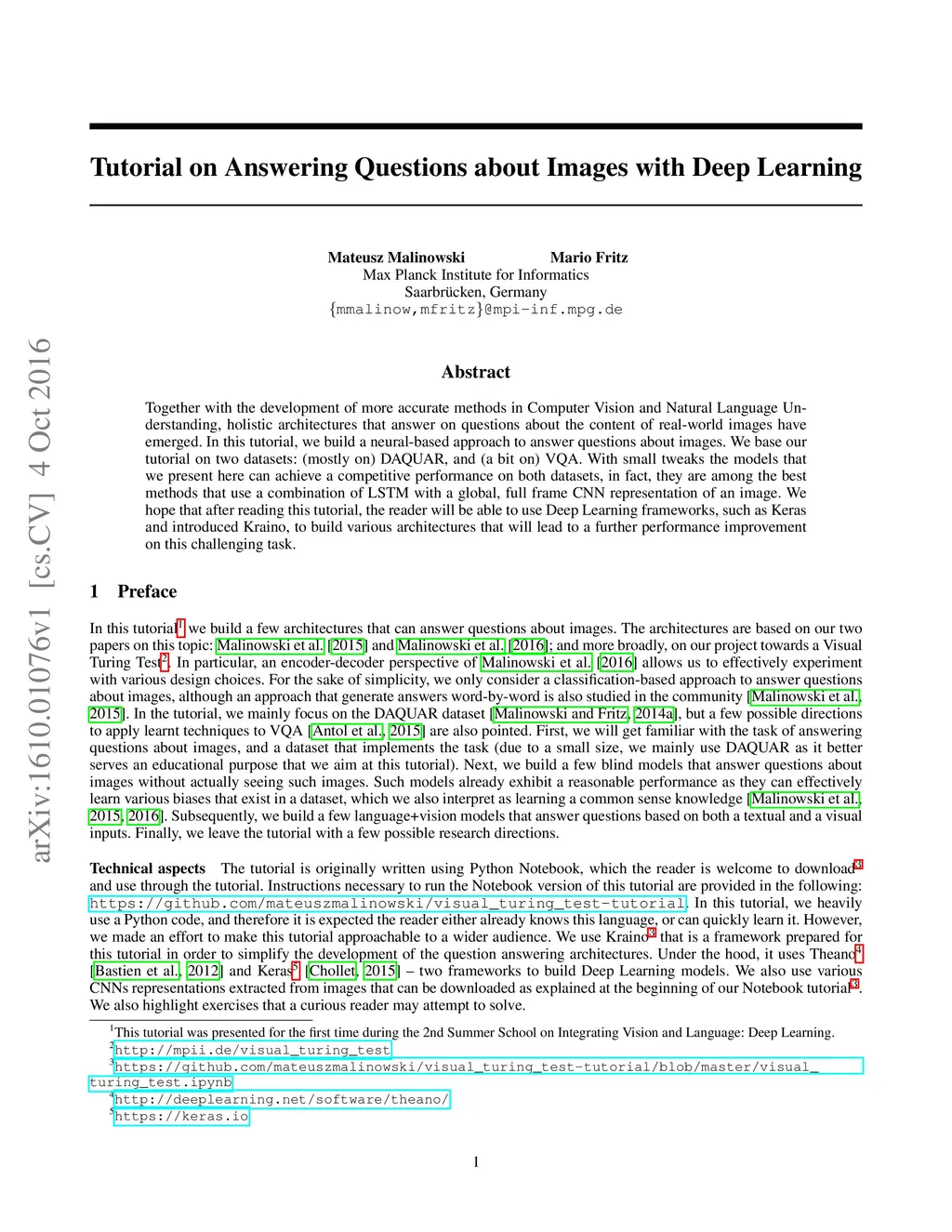Together with the development of more accurate methods in Computer Vision and Natural Language Understanding, holistic architectures that answer on questions about the content of real-world images have emerged. In this tutorial, we build a neural-based approach to answer questions about images. We base our tutorial on two datasets: (mostly on) DAQUAR, and (a bit on) VQA. With small tweaks the models that we present here can achieve a competitive performance on both datasets, in fact, they are among the best methods that use a combination of LSTM with a global, full frame CNN representation of an image. We hope that after reading this tutorial, the reader will be able to use Deep Learning frameworks, such as Keras and introduced Kraino, to build various architectures that will lead to a further performance improvement on this challenging task.
