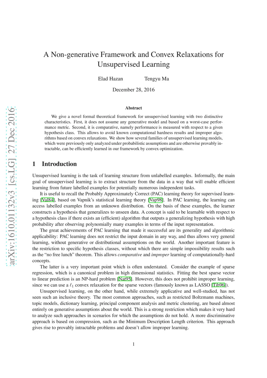 A Non-generative Framework and Convex Relaxations for Unsupervised