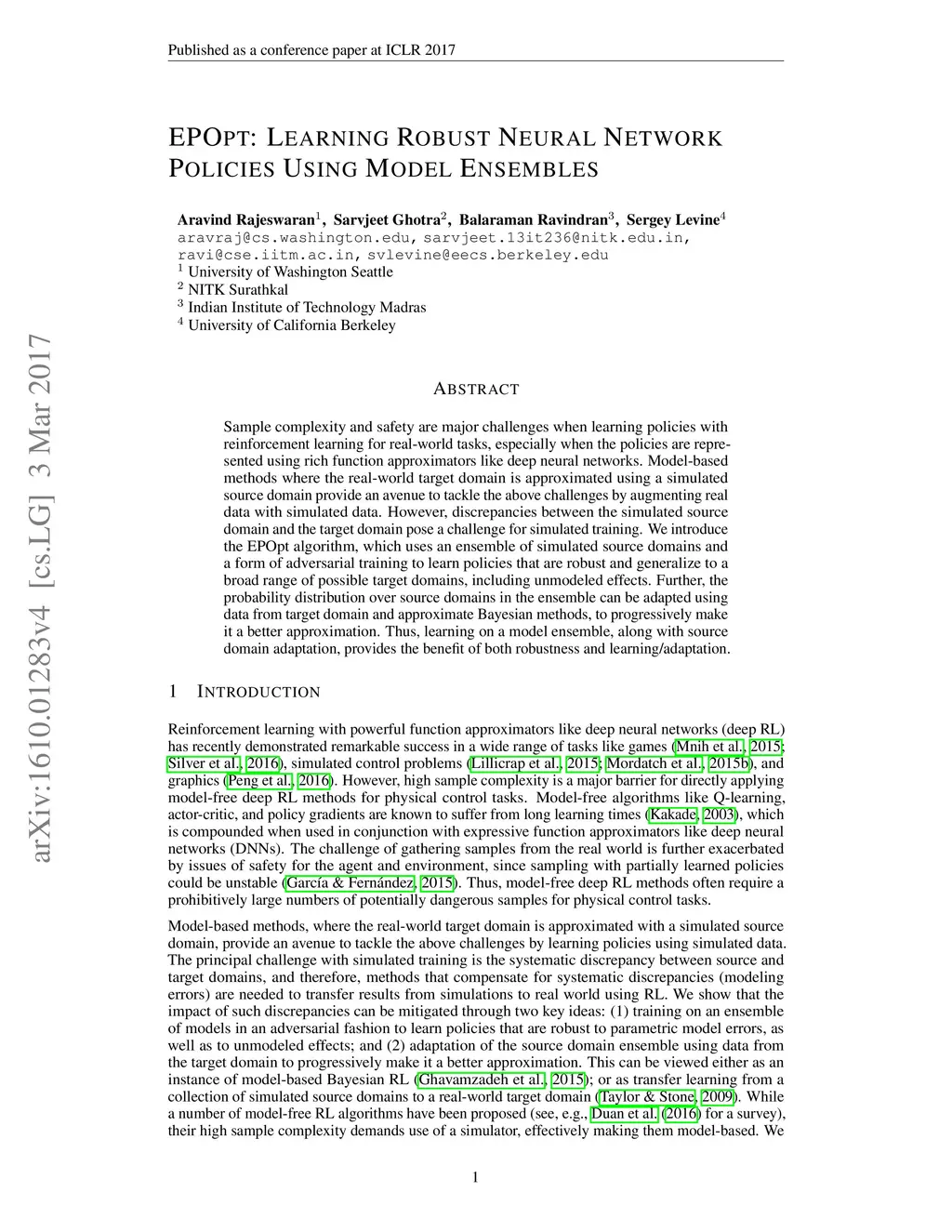 EPOpt: Learning Robust Neural Network Policies Using Model Ensembles