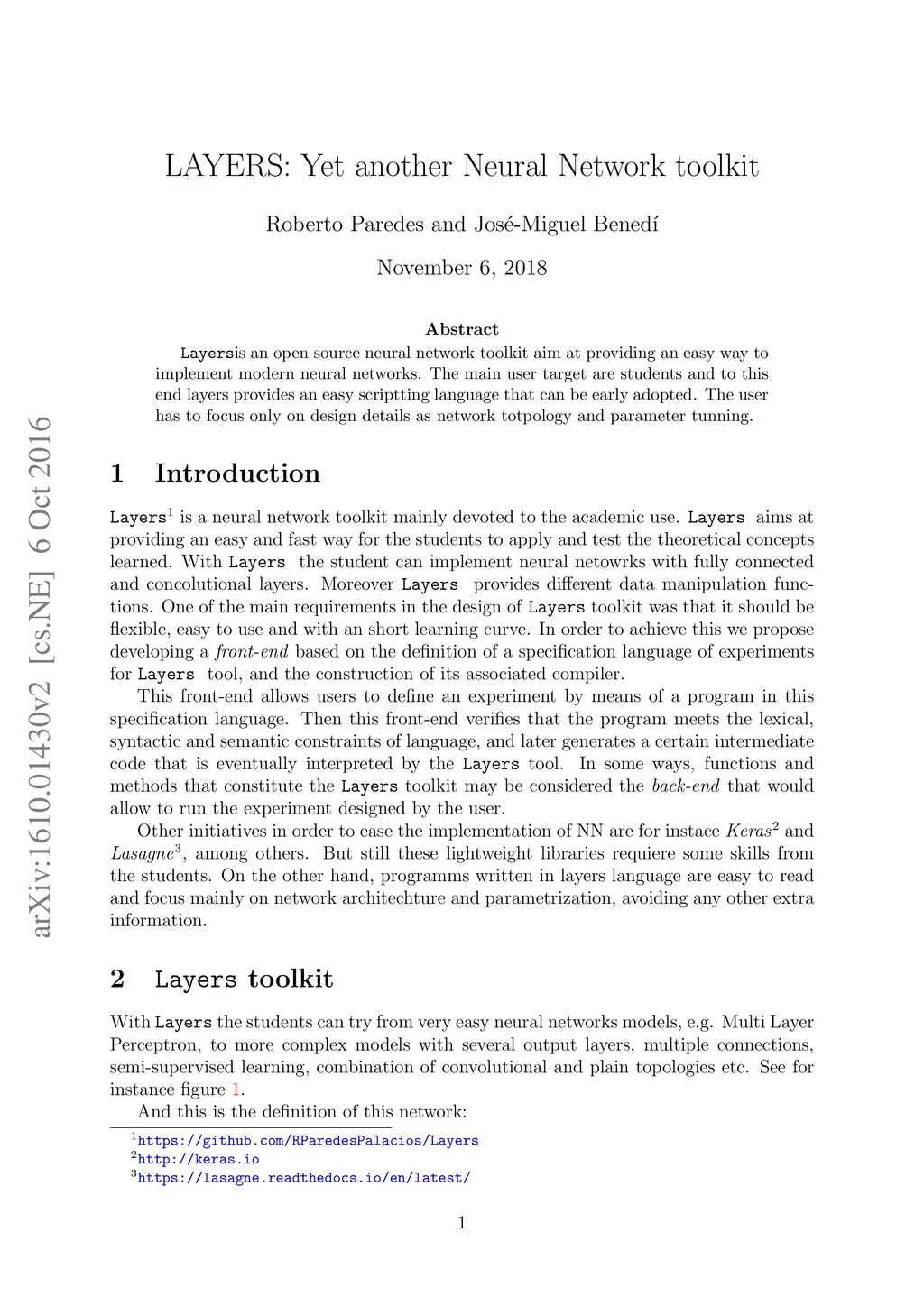 Layers is an open source neural network toolkit aim at providing an easy way to implement modern neural networks. The main user target are students and to this end layers provides an easy scriptting language that can be early adopted. The user has to focus only on design details as network totpology and parameter tunning.