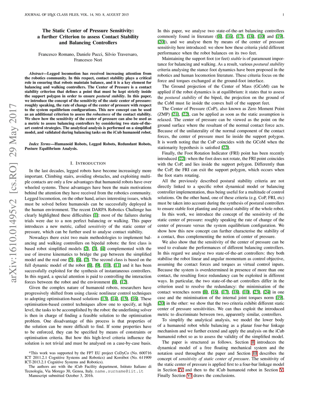 Legged locomotion has received increasing attention from the robotics community. In this respect, contact stability plays a critical role in ensuring that robots maintain balance, and it is a key element for balancing and walking controllers. The Center of Pressure is a contact stability criterion that defines a point that must be kept strictly inside the support polygon in order to ensure postural stability. In this paper, we introduce the concept of the sensitivity of the static center of pressure: roughly speaking, the rate of change of the center of pressure with respect to the system equilibrium configurations. This new concept can be used as an additional criterion to assess the robustness of the contact stability. We show how the sensitivity of the center of pressure can also be used as a metric to assess balancing controllers by considering two state-of-the-art control strategies. The analytical analysis is performed on a simplified model, and validated during balancing tasks on the iCub humanoid robot.
