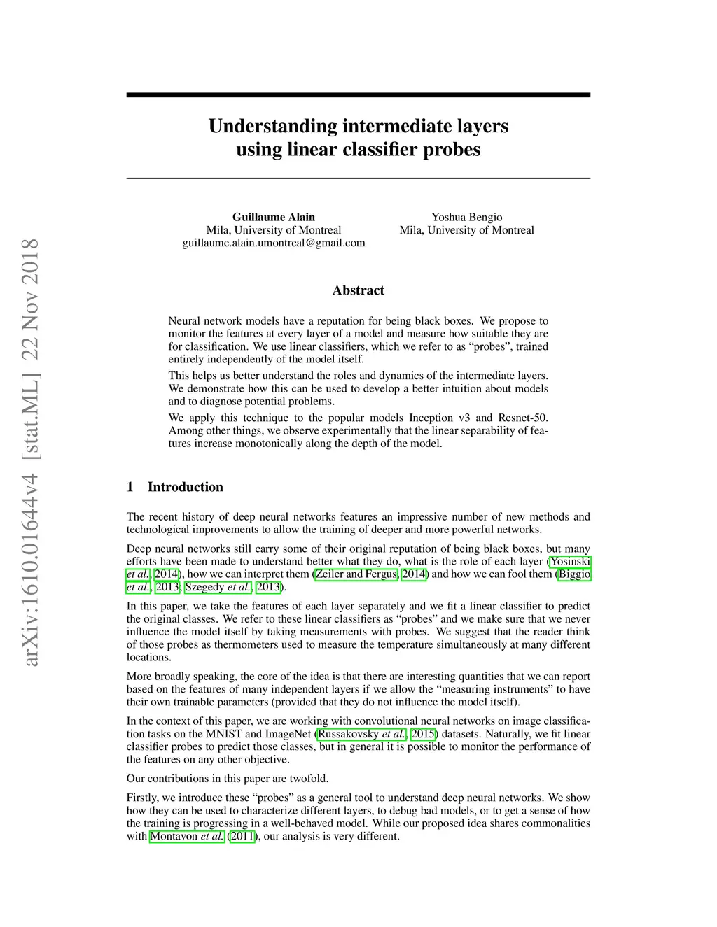 Neural network models have a reputation for being black boxes. We propose to monitor the features at every layer of a model and measure how suitable they are for classification. We use linear classifiers, which we refer to as "probes", trained entirely independently of the model itself. This helps us better understand the roles and dynamics of the intermediate layers. We demonstrate how this can be used to develop a better intuition about models and to diagnose potential problems. We apply this technique to the popular models Inception v3 and Resnet-50. Among other things, we observe experimentally that the linear separability of features increase monotonically along the depth of the model.