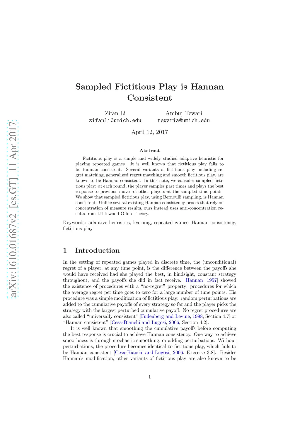 Fictitious play is a simple and widely studied adaptive heuristic for playing repeated games. It is well known that fictitious play fails to be Hannan consistent. Several variants of fictitious play including regret matching, generalized regret matching and smooth fictitious play, are known to be Hannan consistent. In this note, we consider sampled fictitious play: at each round, the player samples past times and plays the best response to previous moves of other players at the sampled time points. We show that sampled fictitious play, using Bernoulli sampling, is Hannan consistent. Unlike several existing Hannan consistency proofs that rely on concentration of measure results, ours instead uses anti-concentration results from Littlewood-Offord theory.