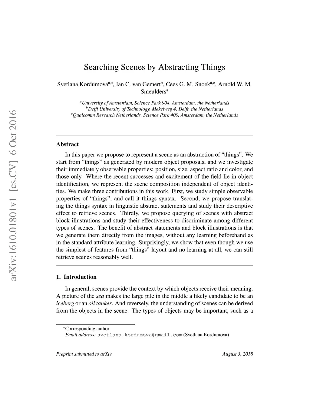 In this paper we propose to represent a scene as an abstraction of 'things'. We start from 'things' as generated by modern object proposals, and we investigate their immediately observable properties: position, size, aspect ratio and color, and those only. Where the recent successes and excitement of the field lie in object identification, we represent the scene composition independent of object identities. We make three contributions in this work. First, we study simple observable properties of 'things', and call it things syntax. Second, we propose translating the things syntax in linguistic abstract statements and study their descriptive effect to retrieve scenes. Thirdly, we propose querying of scenes with abstract block illustrations and study their effectiveness to discriminate among different types of scenes. The benefit of abstract statements and block illustrations is that we generate them directly from the images, without any learning beforehand as in the standard attribute learning. Surprisingly, we show that even though we use the simplest of features from 'things' layout and no learning at all, we can still retrieve scenes reasonably well.