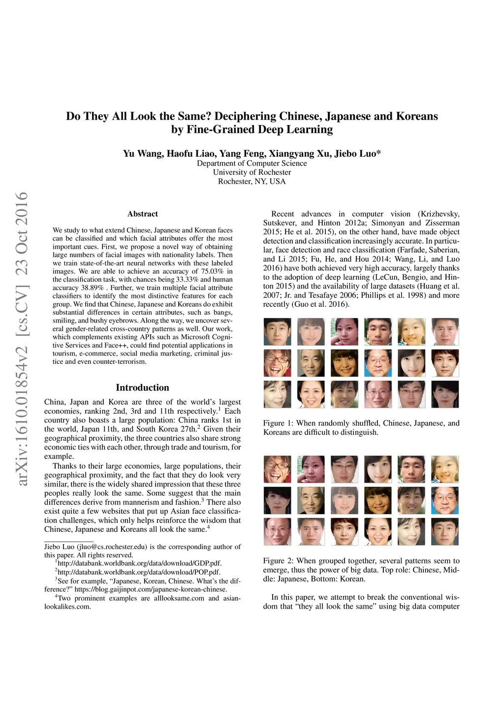 We study to what extend Chinese, Japanese and Korean faces can be classified and which facial attributes offer the most important cues. First, we propose a novel way of obtaining large numbers of facial images with nationality labels. Then we train state-of-the-art neural networks with these labeled images. We are able to achieve an accuracy of 75.03% in the classification task, with chances being 33.33% and human accuracy 38.89% . Further, we train multiple facial attribute classifiers to identify the most distinctive features for each group. We find that Chinese, Japanese and Koreans do exhibit substantial differences in certain attributes, such as bangs, smiling, and bushy eyebrows. Along the way, we uncover several gender-related cross-country patterns as well. Our work, which complements existing APIs such as Microsoft Cognitive Services and Face++, could find potential applications in tourism, e-commerce, social media marketing, criminal justice and even counter-terrorism.