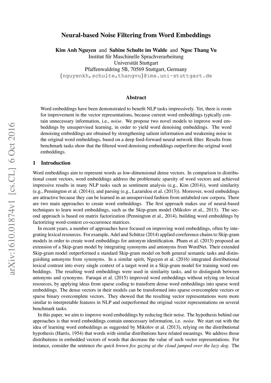 Neural-based Noise Filtering from Word Embeddings