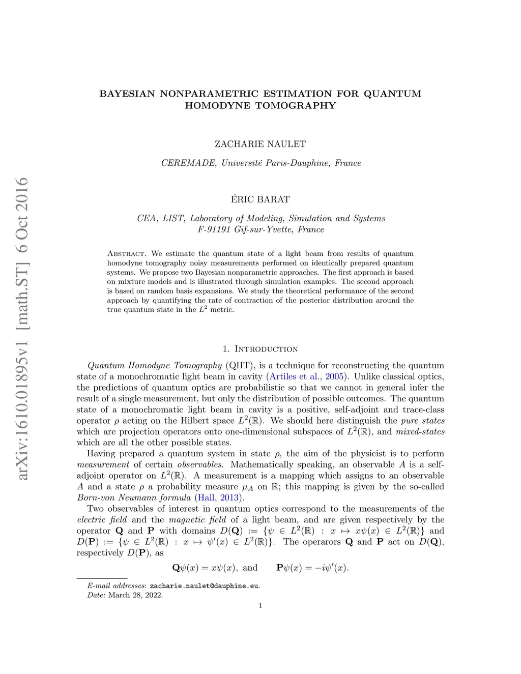 We estimate the quantum state of a light beam from results of quantum homodyne tomography noisy measurements performed on identically prepared quantum systems. We propose two Bayesian nonparametric approaches. The first approach is based on mixture models and is illustrated through simulation examples. The second approach is based on random basis expansions. We study the theoretical performance of the second approach by quantifying the rate of contraction of the posterior distribution around the true quantum state in the metric.