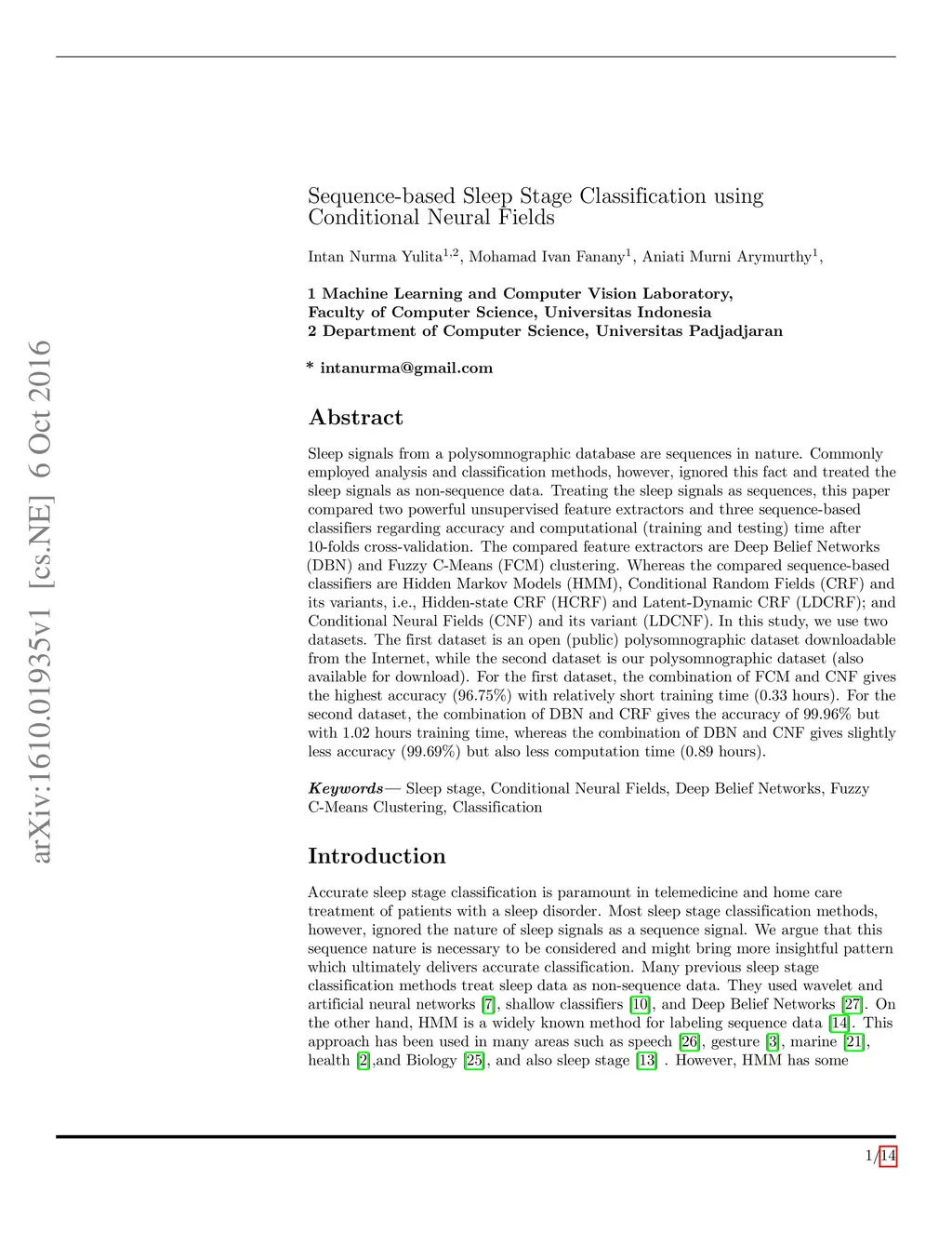 Sleep signals from a polysomnographic database are sequences in nature. Commonly employed analysis and classification methods, however, ignored this fact and treated the sleep signals as non-sequence data. Treating the sleep signals as sequences, this paper compared two powerful unsupervised feature extractors and three sequence-based classifiers regarding accuracy and computational (training and testing) time after 10-folds cross-validation. The compared feature extractors are Deep Belief Networks (DBN) and Fuzzy C-Means (FCM) clustering. Whereas the compared sequence-based classifiers are Hidden Markov Models (HMM), Conditional Random Fields (CRF) and its variants, i.e., Hidden-state CRF (HCRF) and Latent-Dynamic CRF (LDCRF); and Conditional Neural Fields (CNF) and its variant (LDCNF). In this study, we use two datasets. The first dataset is an open (public) polysomnographic dataset downloadable from the Internet, while the second dataset is our polysomnographic dataset (also available for download). For the first dataset, the combination of FCM and CNF gives the highest accuracy (96.75\%) with relatively short training time (0.33 hours). For the second dataset, the combination of DBN and CRF gives the accuracy of 99.96\% but with 1.02 hours training time, whereas the combination of DBN and CNF gives slightly less accuracy (99.69\%) but also less computation time (0.89 hours).