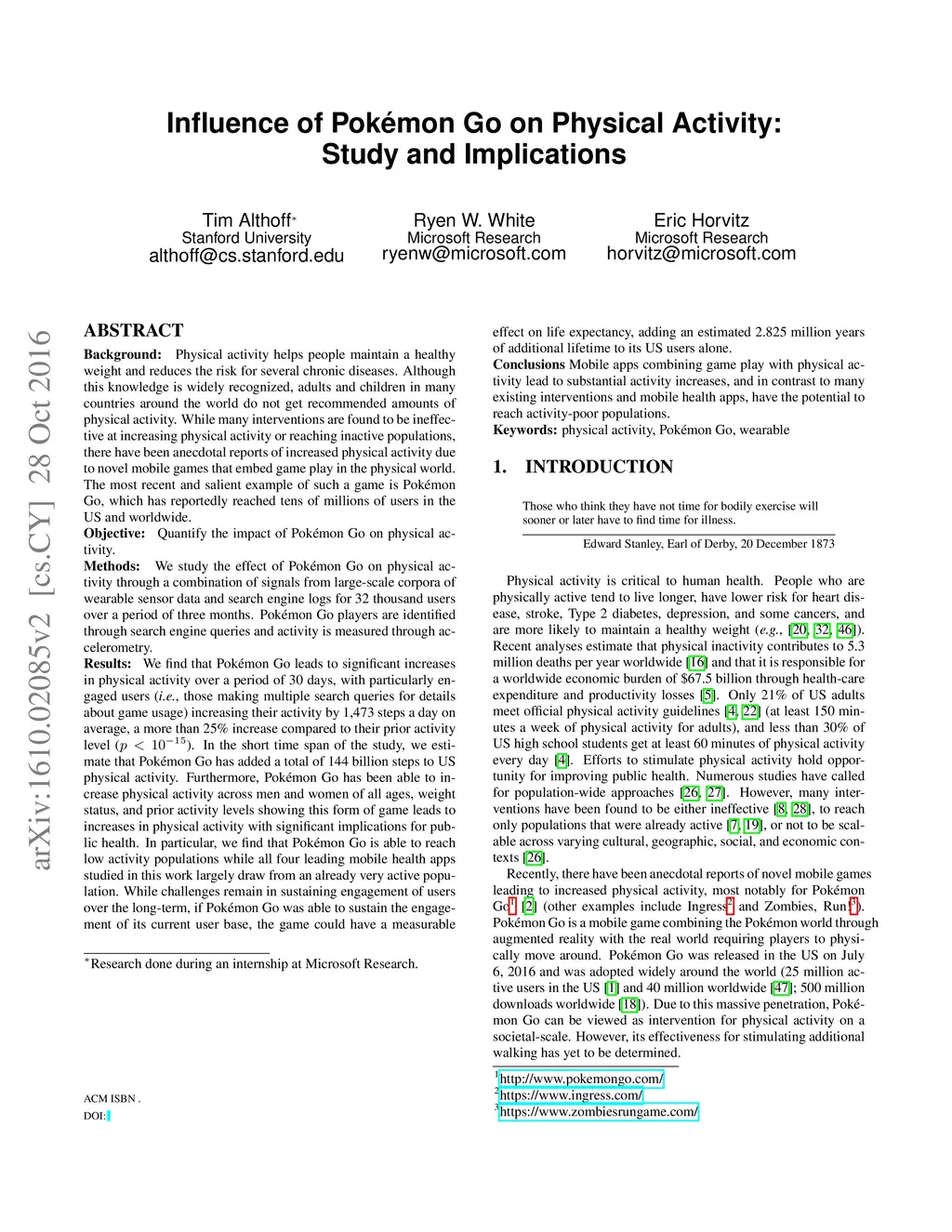 Influence of Pokémon Go on Physical Activity: Study and Implications