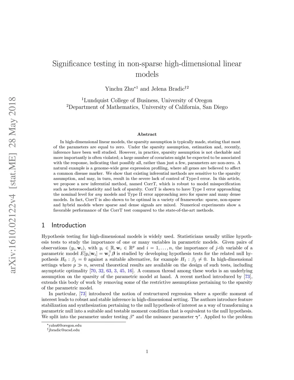 In high-dimensional linear models, the sparsity assumption is typically made, stating that most of the parameters are equal to zero. Under the sparsity assumption, estimation and, recently, inference have been well studied. However, in practice, sparsity assumption is not checkable and more importantly is often violated; a large number of covariates might be expected to be associated with the response, indicating that possibly all, rather than just a few, parameters are non-zero. A natural example is a genome-wide gene expression profiling, where all genes are believed to affect a common disease marker. We show that existing inferential methods are sensitive to the sparsity assumption, and may, in turn, result in the severe lack of control of Type-I error. In this article, we propose a new inferential method, named CorrT, which is robust to model misspecification such as heteroscedasticity and lack of sparsity. CorrT is shown to have Type I error approaching the nominal level for \textit{any} models and Type II error approaching zero for sparse and many dense models. In fact, CorrT is also shown to be optimal in a variety of frameworks: sparse, non-sparse and hybrid models where sparse and dense signals are mixed. Numerical experiments show a favorable performance of the CorrT test compared to the state-of-the-art methods.