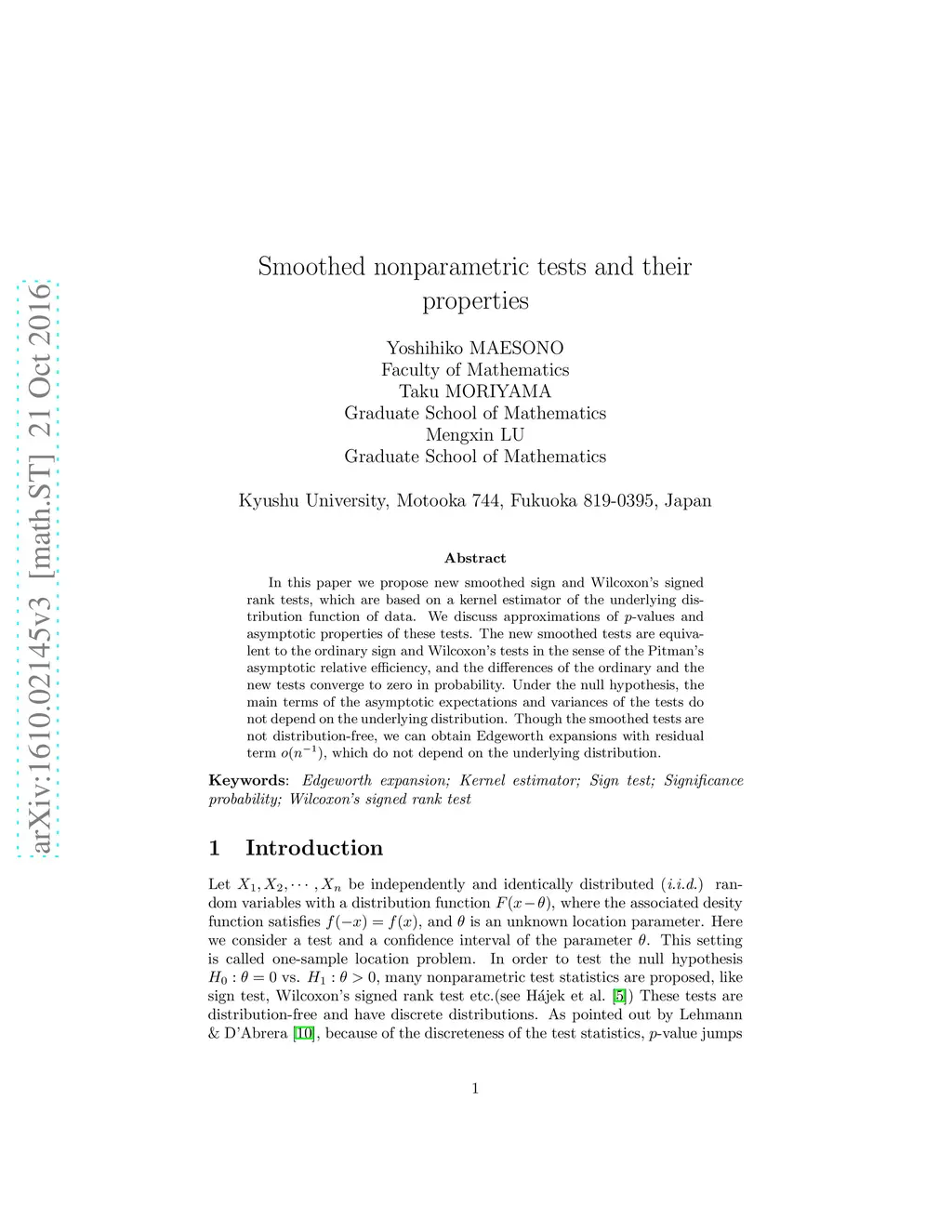 In this paper we propose new smoothed sign and Wilcoxon's signed rank tests, which are based on a kernel estimator of the underlying distribution function of data. We discuss approximations of -values and asymptotic properties of these tests. The new smoothed tests are equivalent to the ordinary sign and Wilcoxon's tests in the sense of the Pitman's asymptotic relative efficiency, and the differences of the ordinary and the new tests converge to zero in probability. Under the null hypothesis, the main terms of the asymptotic expectations and variances of the tests do not depend on the underlying distribution. Though the smoothed tests are not distribution-free, we can obtain Edgeworth expansions with residual term , which do not depend on the underlying distribution.