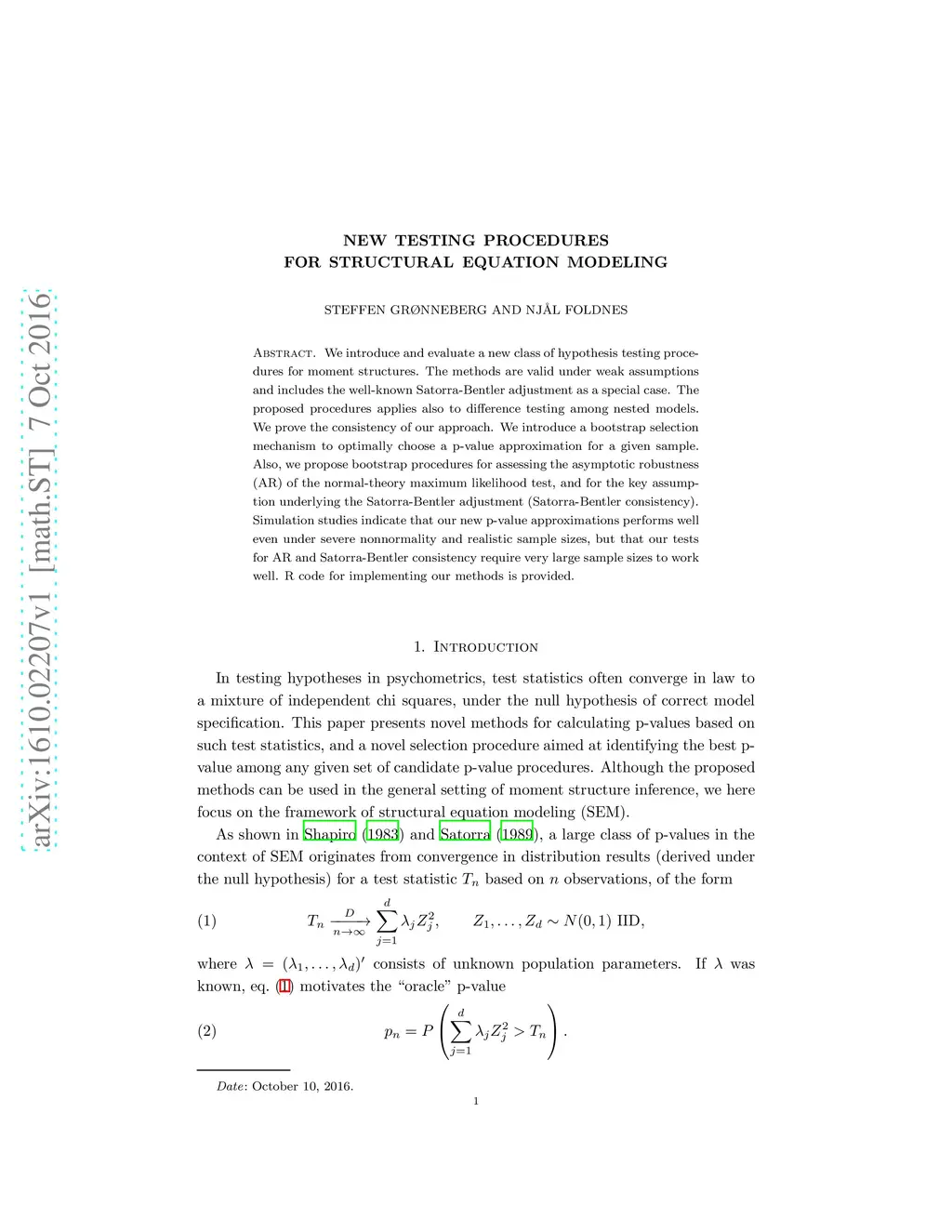 We introduce and evaluate a new class of hypothesis testing procedures for moment structures. The methods are valid under weak assumptions and includes the well-known Satorra-Bentler adjustment as a special case. The proposed procedures applies also to difference testing among nested models. We prove the consistency of our approach. We introduce a bootstrap selection mechanism to optimally choose a p-value approximation for a given sample. Also, we propose bootstrap procedures for assessing the asymptotic robustness (AR) of the normal-theory maximum likelihood test, and for the key assumption underlying the Satorra-Bentler adjustment (Satorra-Bentler consistency). Simulation studies indicate that our new p-value approximations performs well even under severe nonnormality and realistic sample sizes, but that our tests for AR and Satorra-Bentler consistency require very large sample sizes to work well.