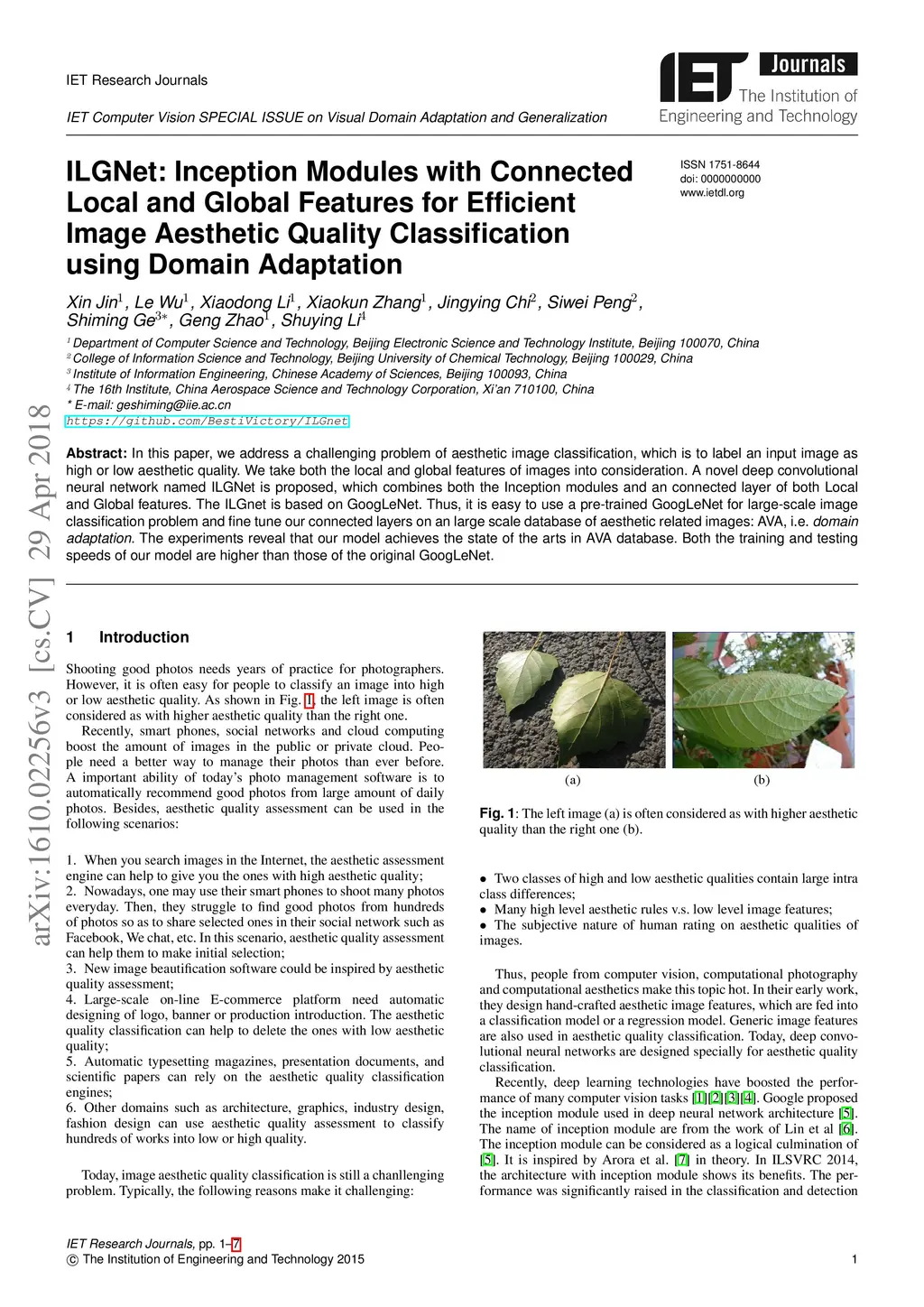 In this paper, we address a challenging problem of aesthetic image classification, which is to label an input image as high or low aesthetic quality. We take both the local and global features of images into consideration. A novel deep convolutional neural network named ILGNet is proposed, which combines both the Inception modules and an connected layer of both Local and Global features. The ILGnet is based on GoogLeNet. Thus, it is easy to use a pre-trained GoogLeNet for large-scale image classification problem and fine tune our connected layers on an large scale database of aesthetic related images: AVA, i.e. \emph{domain adaptation}. The experiments reveal that our model achieves the state of the arts in AVA database. Both the training and testing speeds of our model are higher than those of the original GoogLeNet.