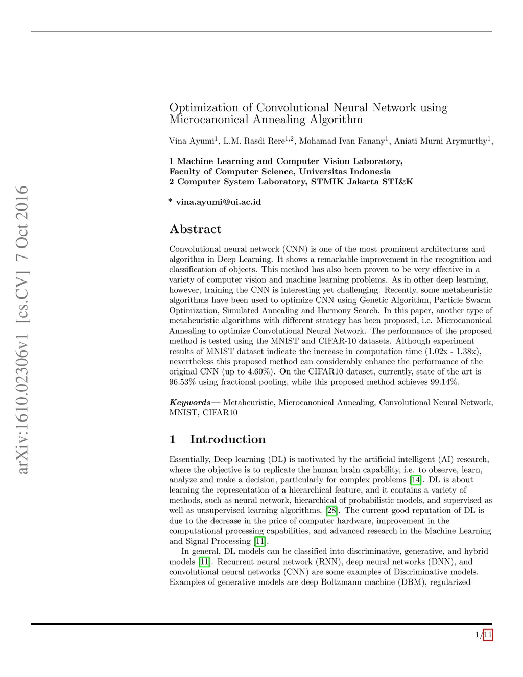 Convolutional neural network (CNN) is one of the most prominent architectures and algorithm in Deep Learning. It shows a remarkable improvement in the recognition and classification of objects. This method has also been proven to be very effective in a variety of computer vision and machine learning problems. As in other deep learning, however, training the CNN is interesting yet challenging. Recently, some metaheuristic algorithms have been used to optimize CNN using Genetic Algorithm, Particle Swarm Optimization, Simulated Annealing and Harmony Search. In this paper, another type of metaheuristic algorithms with different strategy has been proposed, i.e. Microcanonical Annealing to optimize Convolutional Neural Network. The performance of the proposed method is tested using the MNIST and CIFAR-10 datasets. Although experiment results of MNIST dataset indicate the increase in computation time (1.02x - 1.38x), nevertheless this proposed method can considerably enhance the performance of the original CNN (up to 4.60\%). On the CIFAR10 dataset, currently, state of the art is 96.53\% using fractional pooling, while this proposed method achieves 99.14\%.