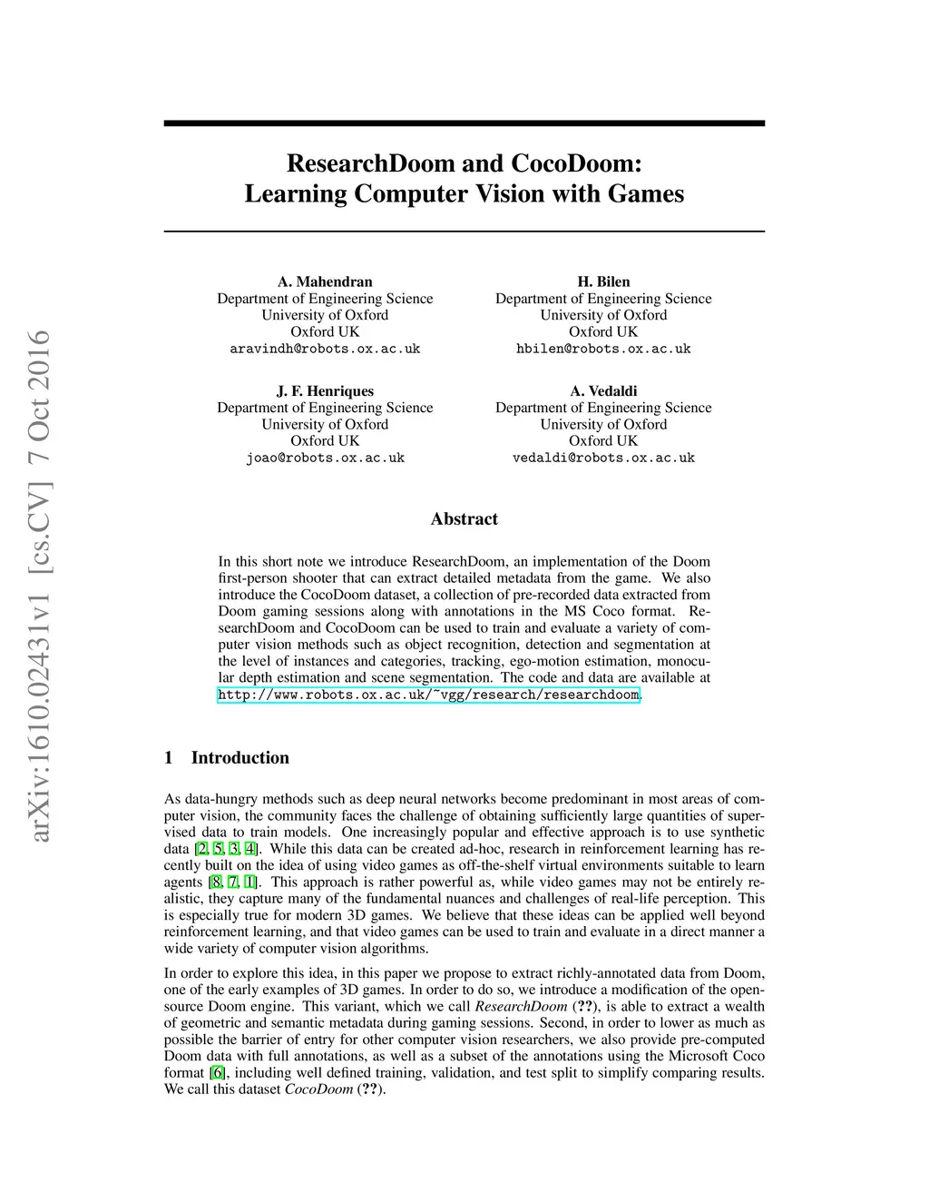 In this short note we introduce ResearchDoom, an implementation of the Doom first-person shooter that can extract detailed metadata from the game. We also introduce the CocoDoom dataset, a collection of pre-recorded data extracted from Doom gaming sessions along with annotations in the MS Coco format. ResearchDoom and CocoDoom can be used to train and evaluate a variety of computer vision methods such as object recognition, detection and segmentation at the level of instances and categories, tracking, ego-motion estimation, monocular depth estimation and scene segmentation. The code and data are available at http://www.robots.ox.ac.uk/~vgg/research/researchdoom.