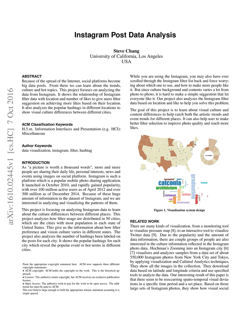 Because of the spread of the Internet, social platforms become big data pools. From there we can learn about the trends, culture and hot topics. This project focuses on analyzing the data from Instagram. It shows the relationship of Instagram filter data with location and number of likes to give users filter suggestion on achieving more likes based on their location. It also analyzes the popular hashtags in different locations to show visual culture differences between different cities.
