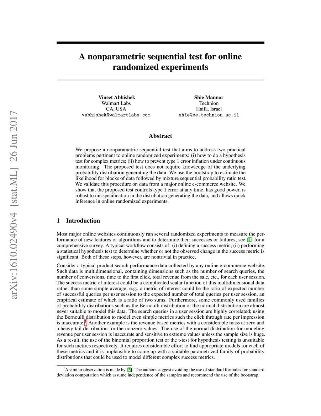 We propose a nonparametric sequential test that aims to address two practical problems pertinent to online randomized experiments: (i) how to do a hypothesis test for complex metrics; (ii) how to prevent type error inflation under continuous monitoring. The proposed test does not require knowledge of the underlying probability distribution generating the data. We use the bootstrap to estimate the likelihood for blocks of data followed by mixture sequential probability ratio test. We validate this procedure on data from a major online e-commerce website. We show that the proposed test controls type error at any time, has good power, is robust to misspecification in the distribution generating the data, and allows quick inference in online randomized experiments.