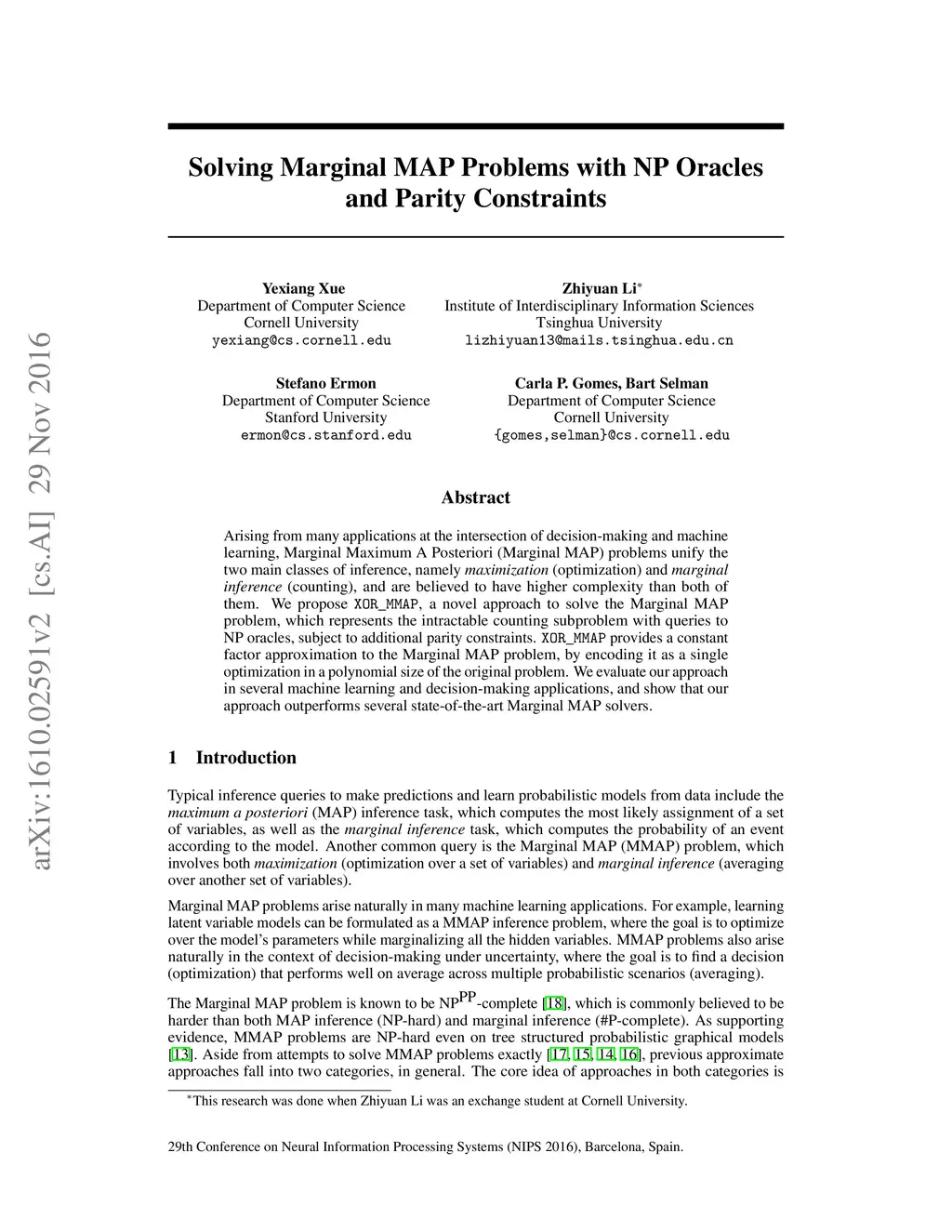 Arising from many applications at the intersection of decision making and machine learning, Marginal Maximum A Posteriori (Marginal MAP) Problems unify the two main classes of inference, namely maximization (optimization) and marginal inference (counting), and are believed to have higher complexity than both of them. We propose XOR_MMAP, a novel approach to solve the Marginal MAP Problem, which represents the intractable counting subproblem with queries to NP oracles, subject to additional parity constraints. XOR_MMAP provides a constant factor approximation to the Marginal MAP Problem, by encoding it as a single optimization in polynomial size of the original problem. We evaluate our approach in several machine learning and decision making applications, and show that our approach outperforms several state-of-the-art Marginal MAP solvers.