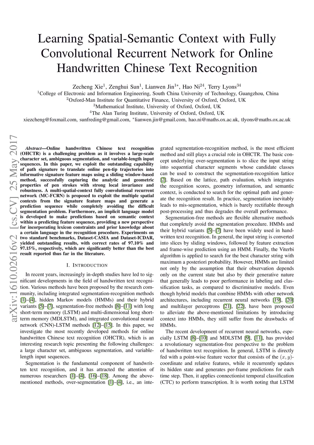 Online handwritten Chinese text recognition (OHCTR) is a challenging problem as it involves a large-scale character set, ambiguous segmentation, and variable-length input sequences. In this paper, we exploit the outstanding capability of path signature to translate online pen-tip trajectories into informative signature feature maps using a sliding window-based method, successfully capturing the analytic and geometric properties of pen strokes with strong local invariance and robustness. A multi-spatial-context fully convolutional recurrent network (MCFCRN) is proposed to exploit the multiple spatial contexts from the signature feature maps and generate a prediction sequence while completely avoiding the difficult segmentation problem. Furthermore, an implicit language model is developed to make predictions based on semantic context within a predicting feature sequence, providing a new perspective for incorporating lexicon constraints and prior knowledge about a certain language in the recognition procedure. Experiments on two standard benchmarks, Dataset-CASIA and Dataset-ICDAR, yielded outstanding results, with correct rates of 97.10% and 97.15%, respectively, which are significantly better than the best result reported thus far in the literature.