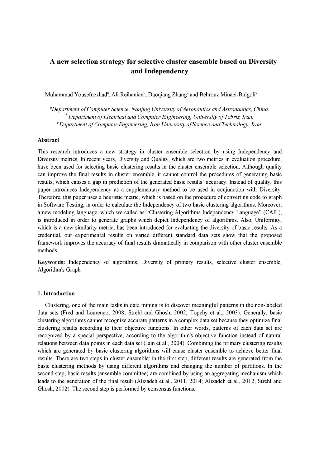 This research introduces a new strategy in cluster ensemble selection by using Independency and Diversity metrics. In recent years, Diversity and Quality, which are two metrics in evaluation procedure, have been used for selecting basic clustering results in the cluster ensemble selection. Although quality can improve the final results in cluster ensemble, it cannot control the procedures of generating basic results, which causes a gap in prediction of the generated basic results' accuracy. Instead of quality, this paper introduces Independency as a supplementary method to be used in conjunction with Diversity. Therefore, this paper uses a heuristic metric, which is based on the procedure of converting code to graph in Software Testing, in order to calculate the Independency of two basic clustering algorithms. Moreover, a new modeling language, which we called as "Clustering Algorithms Independency Language" (CAIL), is introduced in order to generate graphs which depict Independency of algorithms. Also, Uniformity, which is a new similarity metric, has been introduced for evaluating the diversity of basic results. As a credential, our experimental results on varied different standard data sets show that the proposed framework improves the accuracy of final results dramatically in comparison with other cluster ensemble methods.