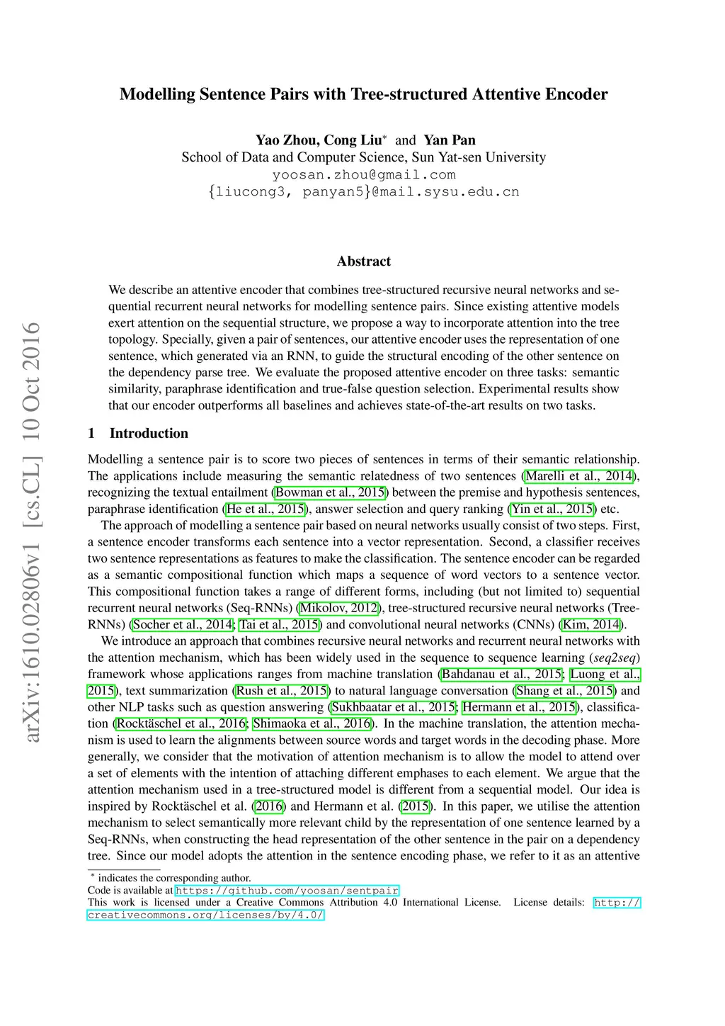 Modelling Sentence Pairs with Tree-structured Attentive Encoder