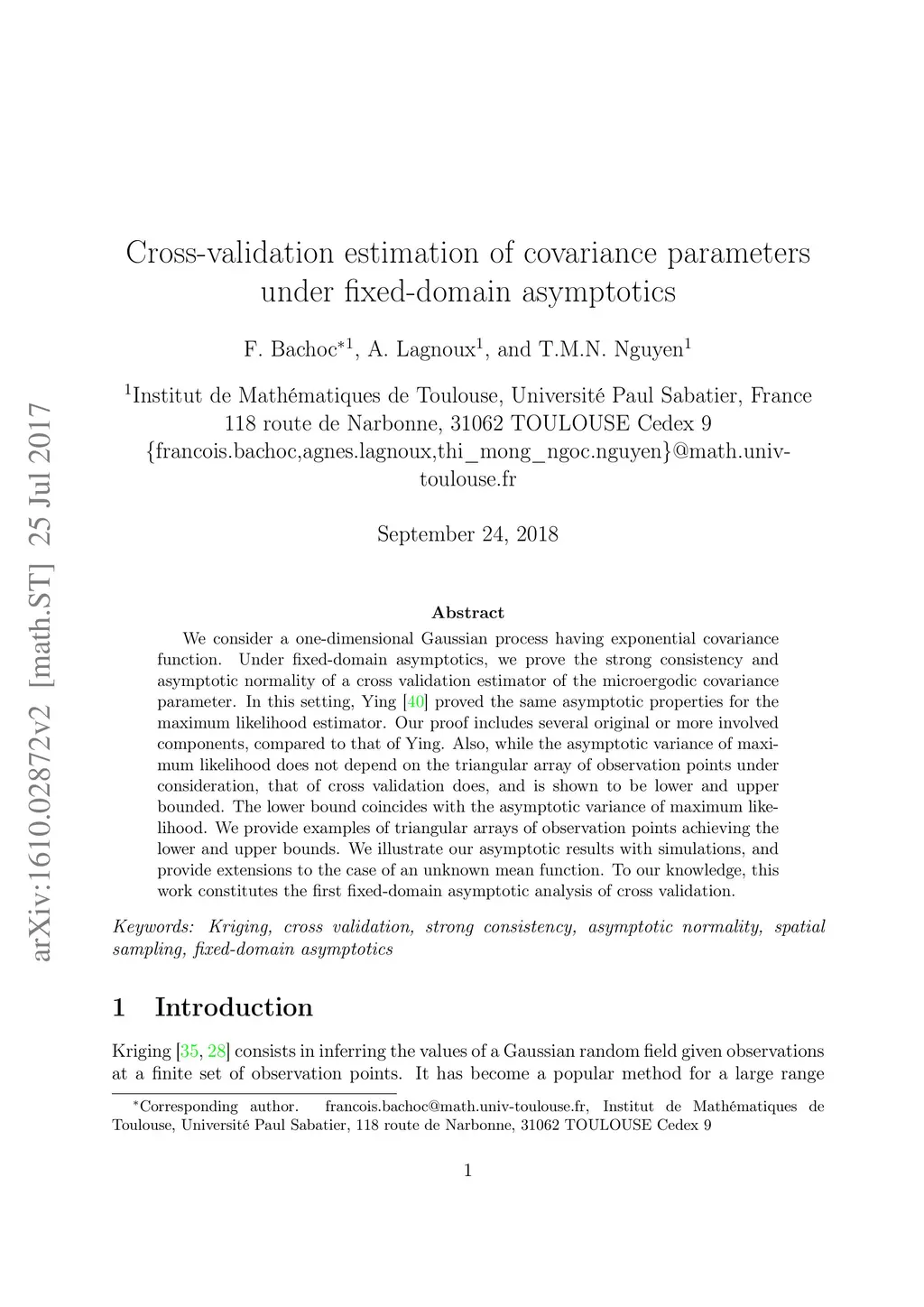 We consider a one-dimensional Gaussian process having exponential covariance function. Under fixed-domain asymptotics, we prove the strong consistency and asymptotic normality of a cross validation estimator of the microergodic covariance parameter. In this setting, Ying [40] proved the same asymptotic properties for the maximum likelihood estimator. Our proof includes several original or more involved components, compared to that of Ying. Also, while the asymptotic variance of maximum likelihood does not depend on the triangular array of observation points under consideration, that of cross validation does, and is shown to be lower and upper bounded. The lower bound coincides with the asymptotic variance of maximum likelihood. We provide examples of triangular arrays of observation points achieving the lower and upper bounds. We illustrate our asymptotic results with simulations, and provide extensions to the case of an unknown mean function. To our knowledge, this work constitutes the first fixed-domain asymptotic analysis of cross validation.