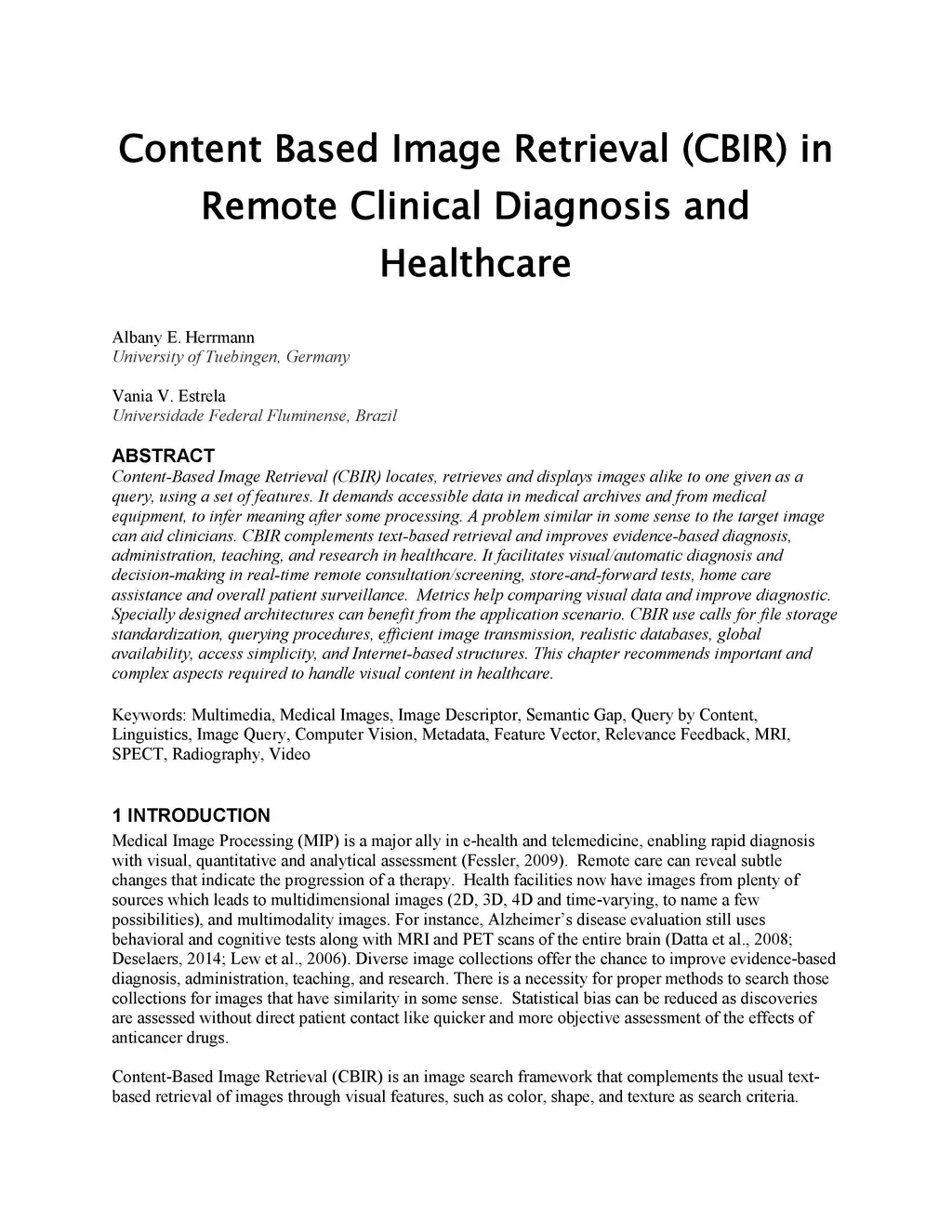 Content-Based Image Retrieval (CBIR) locates, retrieves and displays images alike to one given as a query, using a set of features. It demands accessible data in medical archives and from medical equipment, to infer meaning after some processing. A problem similar in some sense to the target image can aid clinicians. CBIR complements text-based retrieval and improves evidence-based diagnosis, administration, teaching, and research in healthcare. It facilitates visual/automatic diagnosis and decision-making in real-time remote consultation/screening, store-and-forward tests, home care assistance and overall patient surveillance. Metrics help comparing visual data and improve diagnostic. Specially designed architectures can benefit from the application scenario. CBIR use calls for file storage standardization, querying procedures, efficient image transmission, realistic databases, global availability, access simplicity, and Internet-based structures. This chapter recommends important and complex aspects required to handle visual content in healthcare.