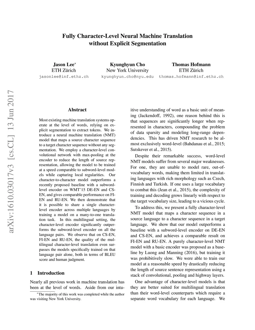 Fully Character-Level Neural Machine Translation without Explicit