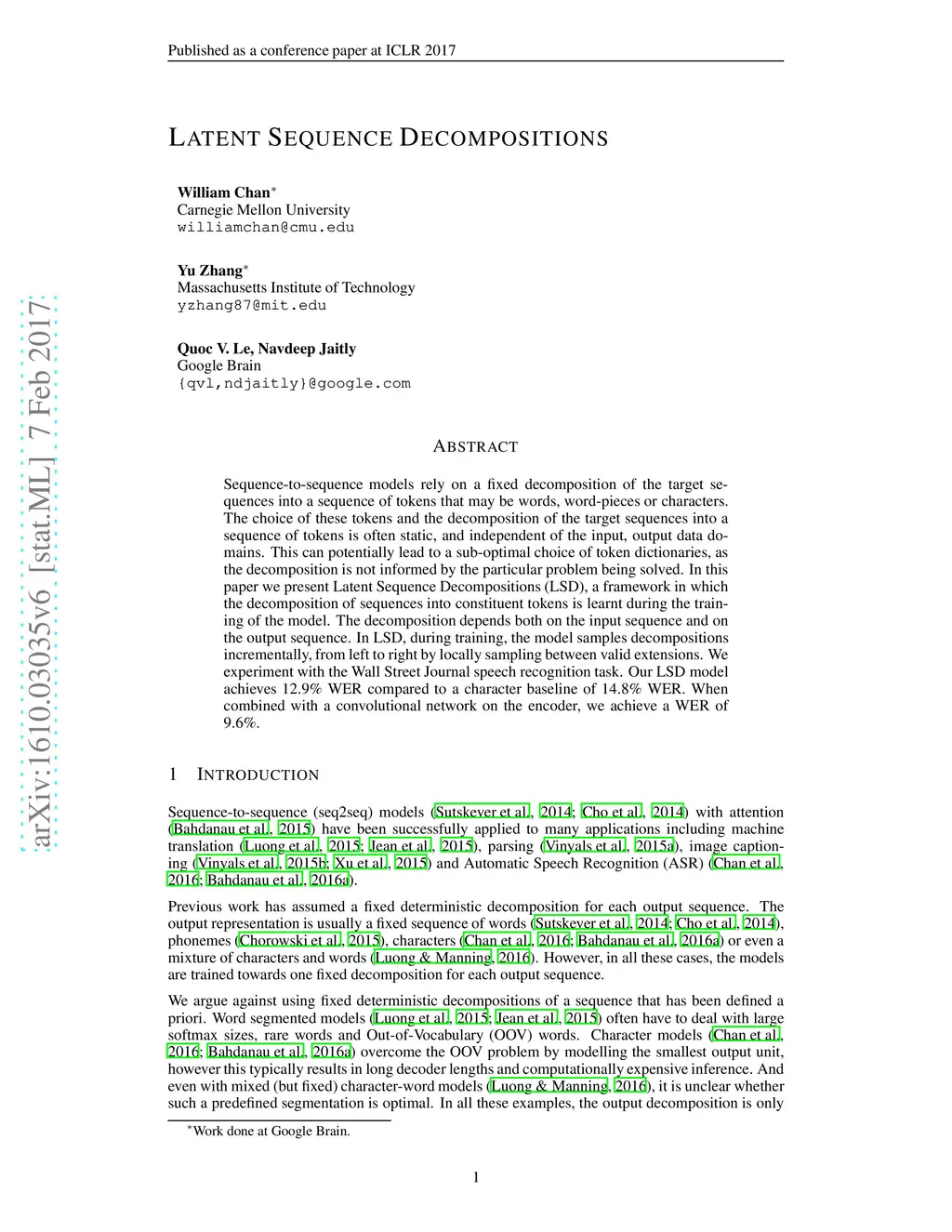 We present the Latent Sequence Decompositions (LSD) framework. LSD decomposes sequences with variable lengthed output units as a function of both the input sequence and the output sequence. We present a training algorithm which samples valid extensions and an approximate decoding algorithm. We experiment with the Wall Street Journal speech recognition task. Our LSD model achieves 12.9% WER compared to a character baseline of 14.8% WER. When combined with a convolutional network on the encoder, we achieve 9.6% WER.