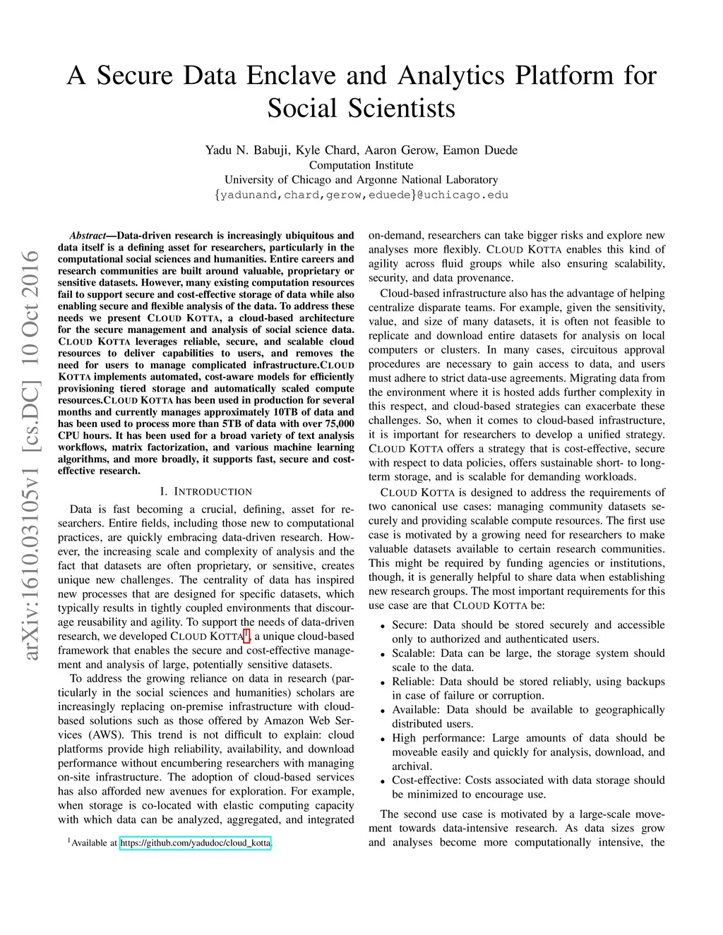 Data-driven research is increasingly ubiquitous and data itself is a defining asset for researchers, particularly in the computational social sciences and humanities. Entire careers and research communities are built around valuable, proprietary or sensitive datasets. However, many existing computation resources fail to support secure and cost-effective storage of data while also enabling secure and flexible analysis of the data. To address these needs we present CLOUD KOTTA, a cloud-based architecture for the secure management and analysis of social science data. CLOUD KOTTA leverages reliable, secure, and scalable cloud resources to deliver capabilities to users, and removes the need for users to manage complicated infrastructure. CLOUD KOTTA implements automated, cost-aware models for efficiently provisioning tiered storage and automatically scaled compute resources. CLOUD KOTTA has been used in production for several months and currently manages approximately 10TB of data and has been used to process more than 5TB of data with over 75,000 CPU hours. It has been used for a broad variety of text analysis workflows, matrix factorization, and various machine learning algorithms, and more broadly, it supports fast, secure and cost-effective research.