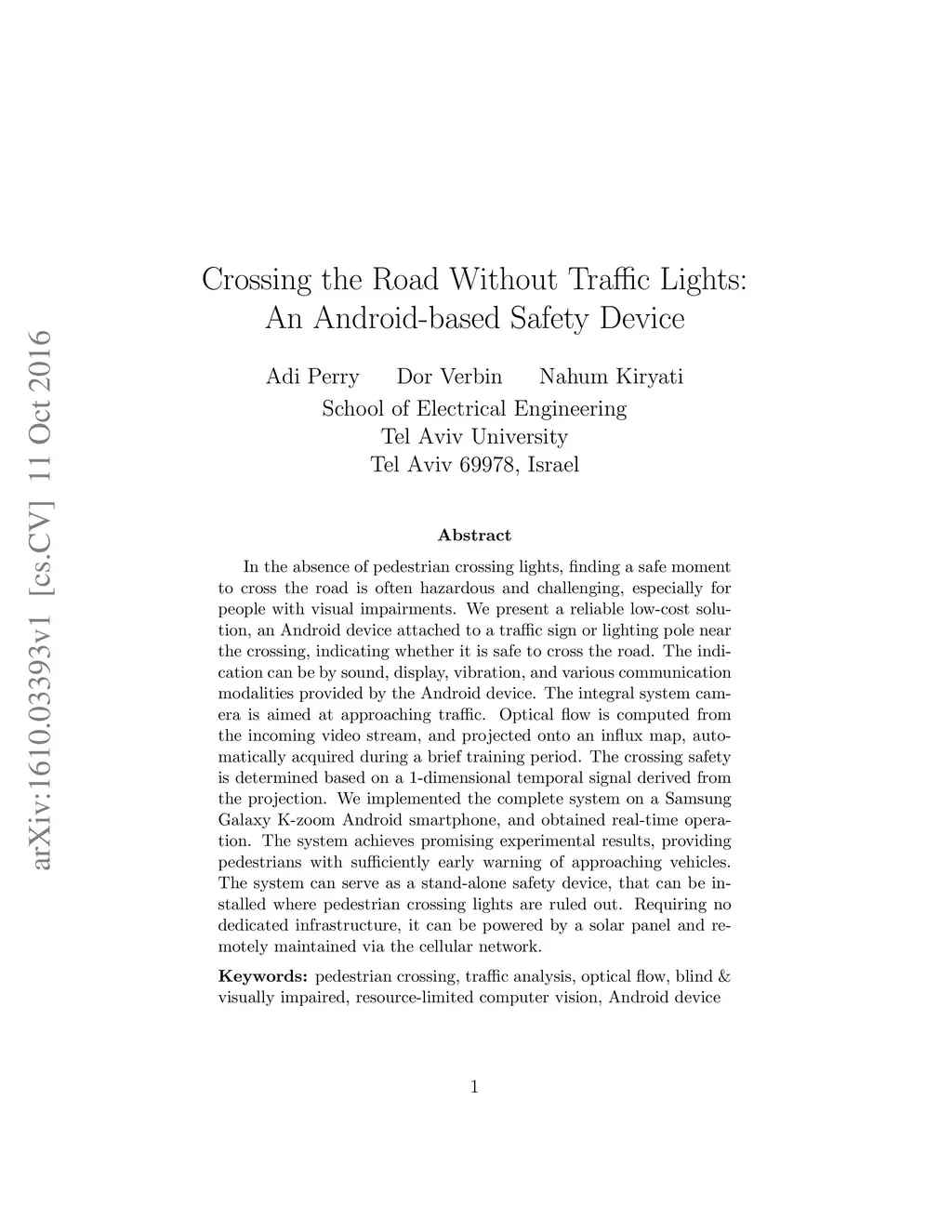 In the absence of pedestrian crossing lights, finding a safe moment to cross the road is often hazardous and challenging, especially for people with visual impairments. We present a reliable low-cost solution, an Android device attached to a traffic sign or lighting pole near the crossing, indicating whether it is safe to cross the road. The indication can be by sound, display, vibration, and various communication modalities provided by the Android device. The integral system camera is aimed at approaching traffic. Optical flow is computed from the incoming video stream, and projected onto an influx map, automatically acquired during a brief training period. The crossing safety is determined based on a 1-dimensional temporal signal derived from the projection. We implemented the complete system on a Samsung Galaxy K-Zoom Android smartphone, and obtained real-time operation. The system achieves promising experimental results, providing pedestrians with sufficiently early warning of approaching vehicles. The system can serve as a stand-alone safety device, that can be installed where pedestrian crossing lights are ruled out. Requiring no dedicated infrastructure, it can be powered by a solar panel and remotely maintained via the cellular network.