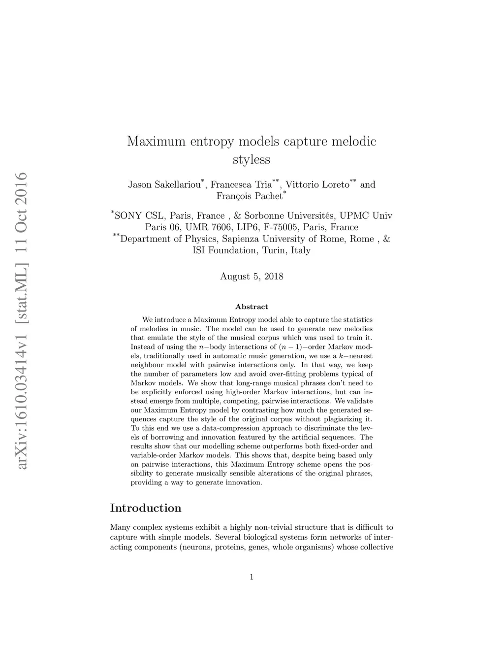We introduce a Maximum Entropy model able to capture the statistics of melodies in music. The model can be used to generate new melodies that emulate the style of the musical corpus which was used to train it. Instead of using the body interactions of order Markov models, traditionally used in automatic music generation, we use a nearest neighbour model with pairwise interactions only. In that way, we keep the number of parameters low and avoid over-fitting problems typical of Markov models. We show that long-range musical phrases don't need to be explicitly enforced using high-order Markov interactions, but can instead emerge from multiple, competing, pairwise interactions. We validate our Maximum Entropy model by contrasting how much the generated sequences capture the style of the original corpus without plagiarizing it. To this end we use a data-compression approach to discriminate the levels of borrowing and innovation featured by the artificial sequences. The results show that our modelling scheme outperforms both fixed-order and variable-order Markov models. This shows that, despite being based only on pairwise interactions, this Maximum Entropy scheme opens the possibility to generate musically sensible alterations of the original phrases, providing a way to generate innovation.