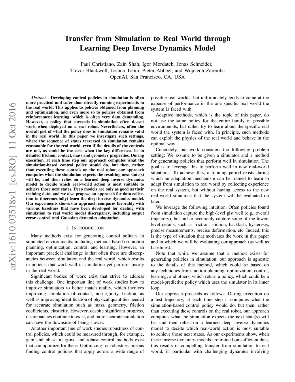 Developing control policies in simulation is often more practical and safer than directly running experiments in the real world. This applies to policies obtained from planning and optimization, and even more so to policies obtained from reinforcement learning, which is often very data demanding. However, a policy that succeeds in simulation often doesn't work when deployed on a real robot. Nevertheless, often the overall gist of what the policy does in simulation remains valid in the real world. In this paper we investigate such settings, where the sequence of states traversed in simulation remains reasonable for the real world, even if the details of the controls are not, as could be the case when the key differences lie in detailed friction, contact, mass and geometry properties. During execution, at each time step our approach computes what the simulation-based control policy would do, but then, rather than executing these controls on the real robot, our approach computes what the simulation expects the resulting next state(s) will be, and then relies on a learned deep inverse dynamics model to decide which real-world action is most suitable to achieve those next states. Deep models are only as good as their training data, and we also propose an approach for data collection to (incrementally) learn the deep inverse dynamics model. Our experiments shows our approach compares favorably with various baselines that have been developed for dealing with simulation to real world model discrepancy, including output error control and Gaussian dynamics adaptation.
