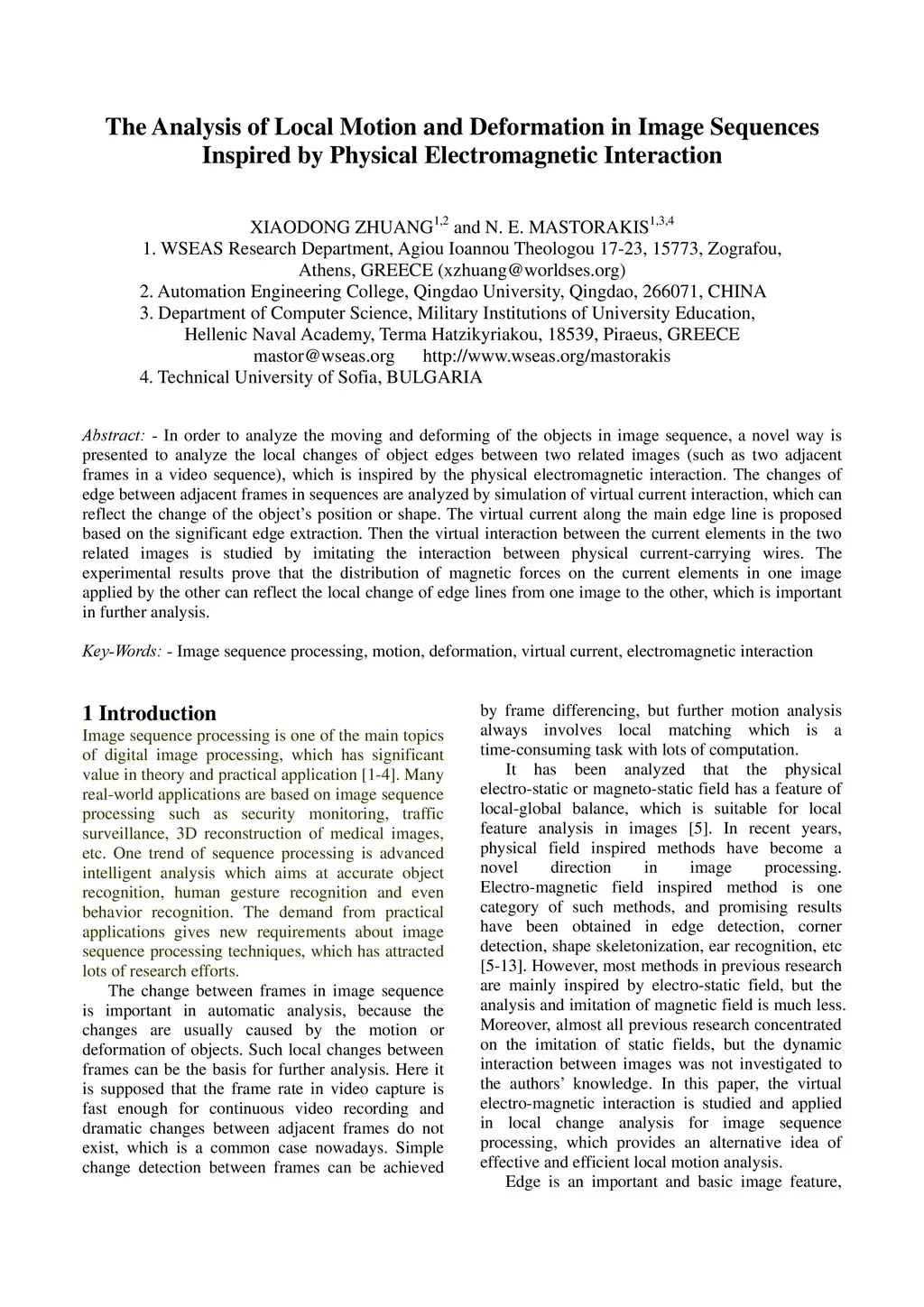 In order to analyze the moving and deforming of the objects in image sequence, a novel way is presented to analyze the local changes of object edges between two related images (such as two adjacent frames in a video sequence), which is inspired by the physical electromagnetic interaction. The changes of edge between adjacent frames in sequences are analyzed by simulation of virtual current interaction, which can reflect the change of the object's position or shape. The virtual current along the main edge line is proposed based on the significant edge extraction. Then the virtual interaction between the current elements in the two related images is studied by imitating the interaction between physical current-carrying wires. The experimental results prove that the distribution of magnetic forces on the current elements in one image applied by the other can reflect the local change of edge lines from one image to the other, which is important in further analysis.