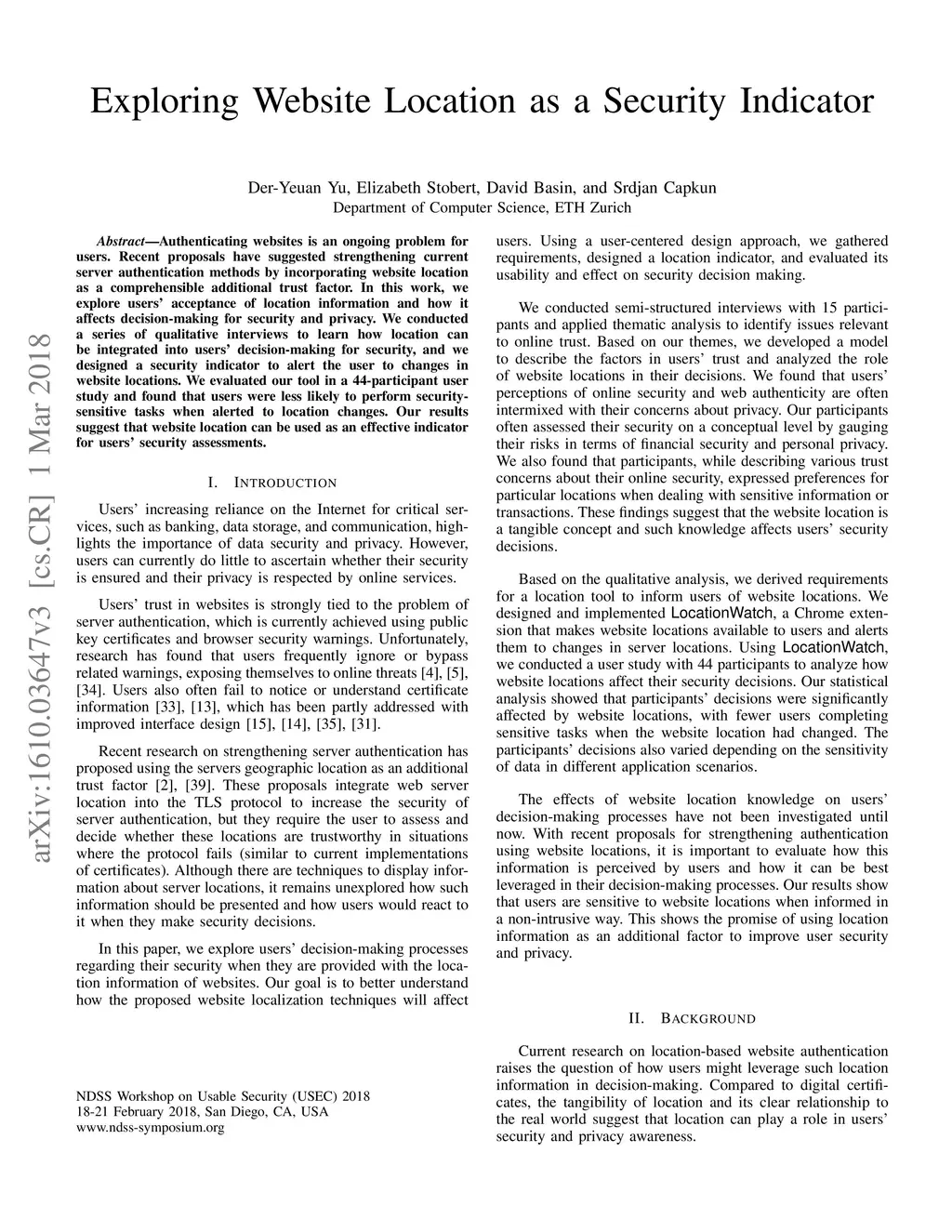 Authenticating websites is an ongoing problem for users. Recent proposals have suggested strengthening current server authentication methods by incorporating website location as a comprehensible additional trust factor. In this work, we explore users' acceptance of location information and how it affects decision-making for security and privacy. We conducted a series of qualitative interviews to learn how location can be integrated into users' decision-making for security, and we designed a security indicator to alert the user to changes in website locations. We evaluated our tool in a 44-participant user study and found that users were less likely to perform security-sensitive tasks when alerted to location changes. Our results suggest that website location can be used as an effective indicator for users' security assessments.