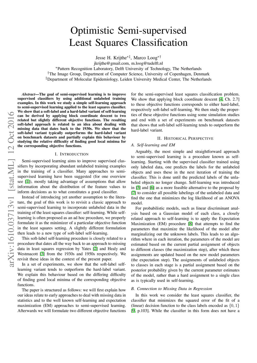 The goal of semi-supervised learning is to improve supervised classifiers by using additional unlabeled training examples. In this work we study a simple self-learning approach to semi-supervised learning applied to the least squares classifier. We show that a soft-label and a hard-label variant of self-learning can be derived by applying block coordinate descent to two related but slightly different objective functions. The resulting soft-label approach is related to an idea about dealing with missing data that dates back to the 1930s. We show that the soft-label variant typically outperforms the hard-label variant on benchmark datasets and partially explain this behaviour by studying the relative difficulty of finding good local minima for the corresponding objective functions.