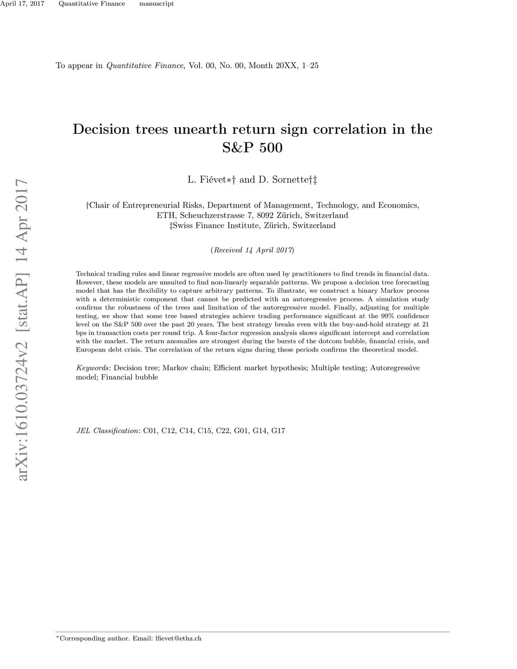 Technical trading rules and linear regressive models are often used by practitioners to find trends in financial data. However, these models are unsuited to find non-linearly separable patterns. We propose a decision tree forecasting model that has the flexibility to capture arbitrary patterns. To illustrate, we construct a binary Markov process with a deterministic component that cannot be predicted with an autoregressive process. A simulation study confirms the robustness of the trees and limitation of the autoregressive model. Finally, adjusting for multiple testing, we show that some tree based strategies achieve trading performance significant at the 99% confidence level on the S&P 500 over the past 20 years. The best strategy breaks even with the buy-and-hold strategy at 21 bps in transaction costs per round trip. A four-factor regression analysis shows significant intercept and correlation with the market. The return anomalies are strongest during the bursts of the dotcom bubble, financial crisis, and European debt crisis. The correlation of the return signs during these periods confirms the theoretical model.