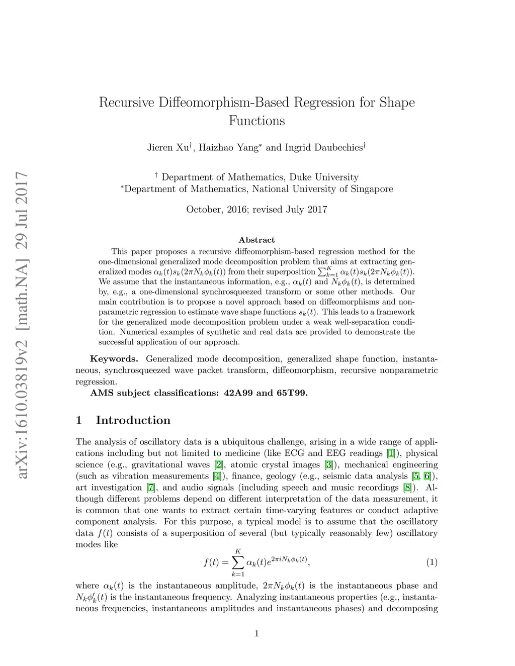 This paper proposes a recursive diffeomorphism based regression method for one-dimensional generalized mode decomposition problem that aims at extracting generalized modes from their superposition . First, a one-dimensional synchrosqueezed transform is applied to estimate instantaneous information, e.g., and . Second, a novel approach based on diffeomorphisms and nonparametric regression is proposed to estimate wave shape functions . These two methods lead to a framework for the generalized mode decomposition problem under a weak well-separation condition. Numerical examples of synthetic and real data are provided to demonstrate the fruitful applications of these methods.