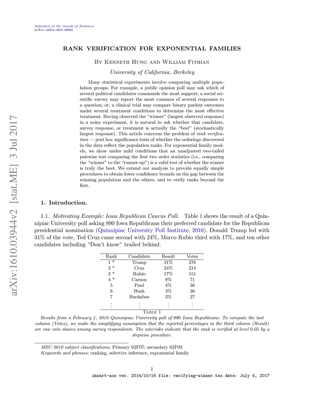Many statistical experiments involve comparing multiple population groups. For example, a public opinion poll may ask which of several political candidates commands the most support; a social scientific survey may report the most common of several responses to a question; or, a clinical trial may compare binary patient outcomes under several treatment conditions to determine the most effective treatment. Having observed the "winner" (largest observed response) in a noisy experiment, it is natural to ask whether that candidate, survey response, or treatment is actually the "best" (stochastically largest response). This article concerns the problem of rank verification --- post hoc significance tests of whether the orderings discovered in the data reflect the population ranks. For exponential family models, we show under mild conditions that an unadjusted two-tailed pairwise test comparing the top two observations (i.e., comparing the "winner" to the "runner-up") is a valid test of whether the winner is truly the best. We extend our analysis to provide equally simple procedures to obtain lower confidence bounds on the gap between the winning population and the others, and to verify ranks beyond the first.