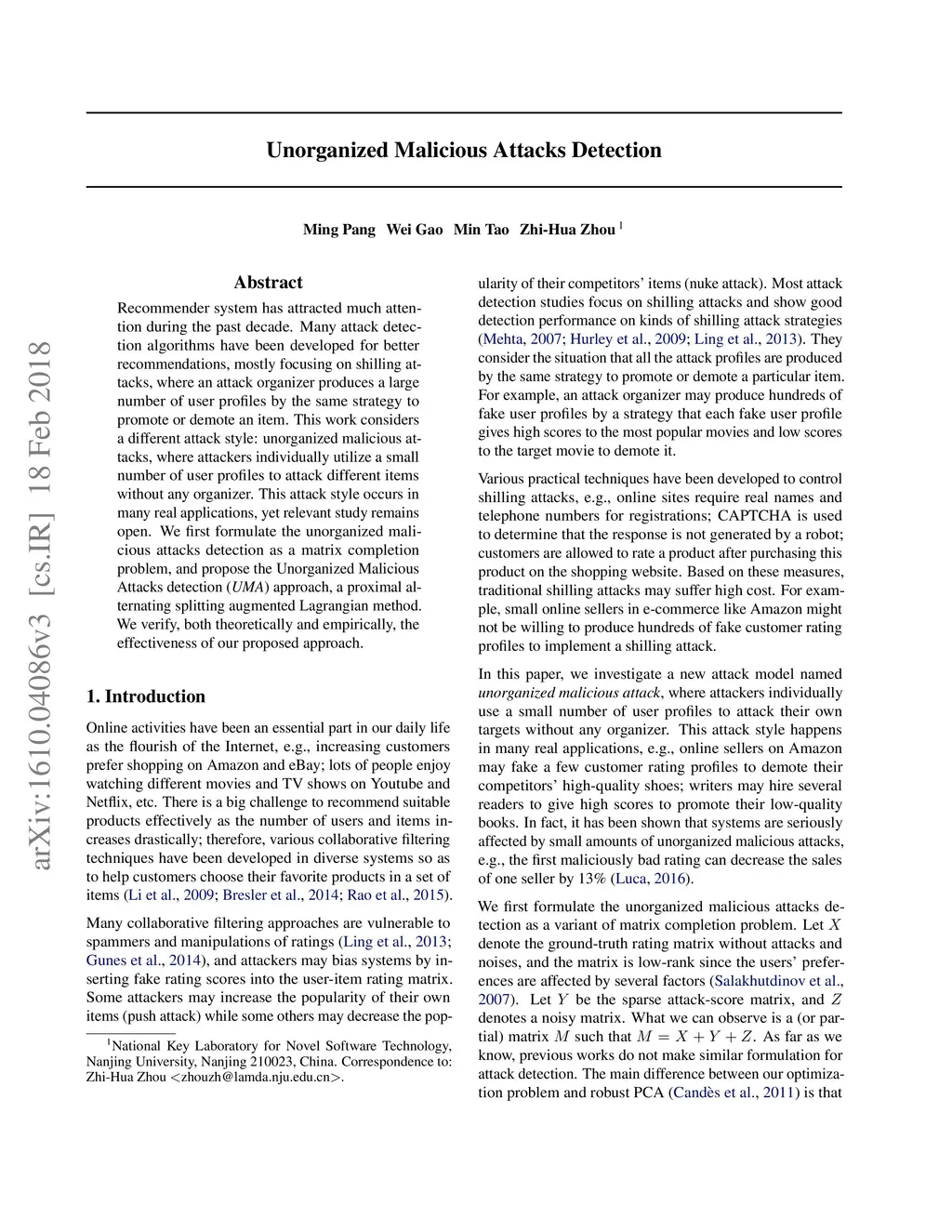Recommender system has attracted much attention during the past decade. Many attack detection algorithms have been developed for better recommendations, mostly focusing on shilling attacks, where an attack organizer produces a large number of user profiles by the same strategy to promote or demote an item. This work considers a different attack style: unorganized malicious attacks, where attackers individually utilize a small number of user profiles to attack different items without any organizer. This attack style occurs in many real applications, yet relevant study remains open. We first formulate the unorganized malicious attacks detection as a matrix completion problem, and propose the Unorganized Malicious Attacks detection (UMA) approach, a proximal alternating splitting augmented Lagrangian method. We verify, both theoretically and empirically, the effectiveness of our proposed approach.