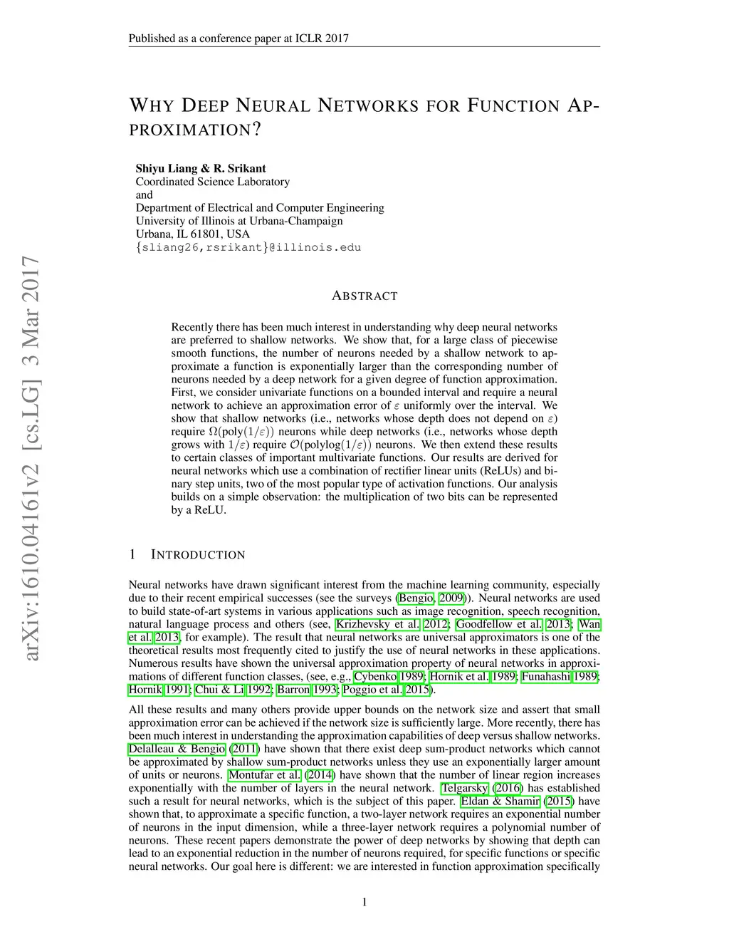 Recently there has been much interest in understanding why deep neural networks are preferred to shallow networks. We show that, for a large class of piecewise smooth functions, the number of neurons needed by a shallow network to approximate a function is exponentially larger than the corresponding number of neurons needed by a deep network for a given degree of function approximation. First, we consider univariate functions on a bounded interval and require a neural network to achieve an approximation error of uniformly over the interval. We show that shallow networks (i.e., networks whose depth does not depend on ) require neurons while deep networks (i.e., networks whose depth grows with ) require neurons. We then extend these results to certain classes of important multivariate functions. Our results are derived for neural networks which use a combination of rectifier linear units (ReLUs) and binary step units, two of the most popular type of activation functions. Our analysis builds on a simple observation: the multiplication of two bits can be represented by a ReLU.
